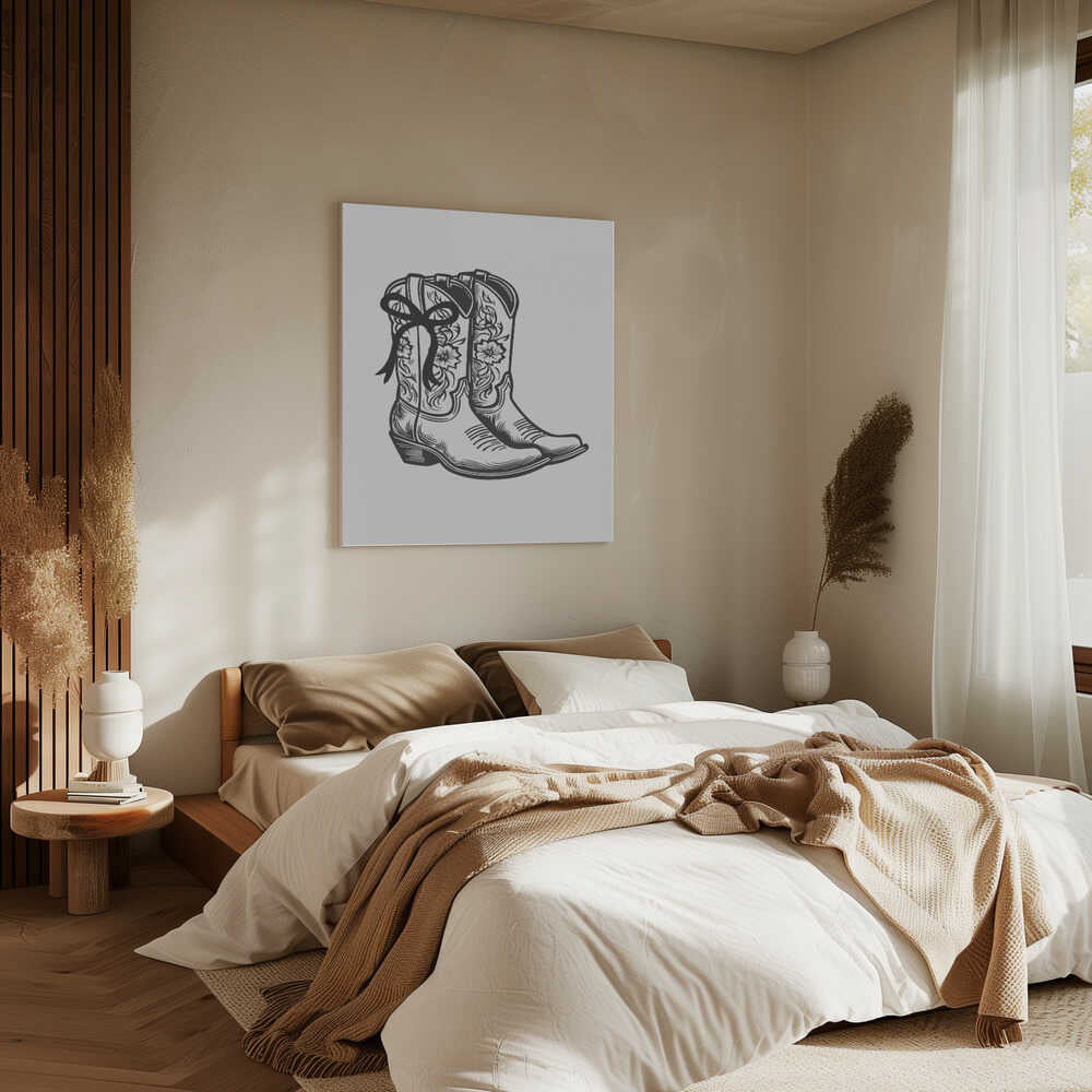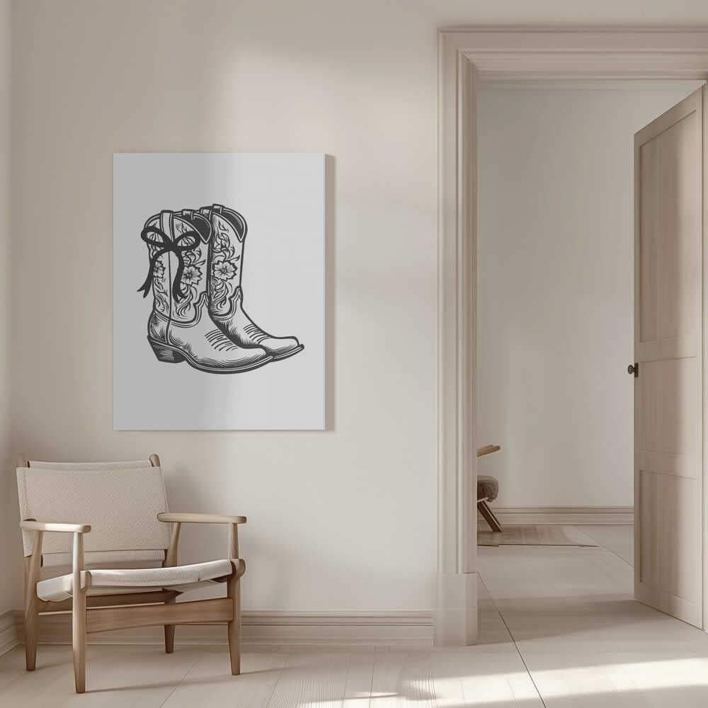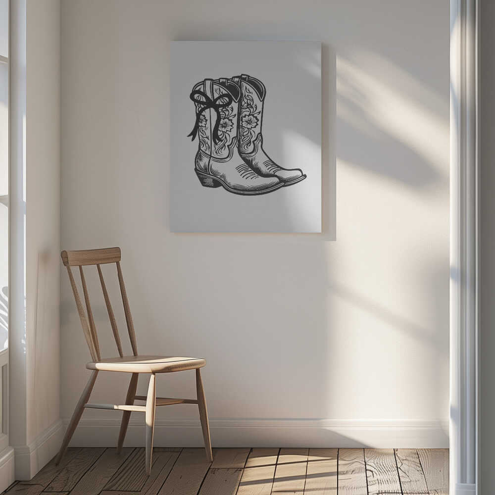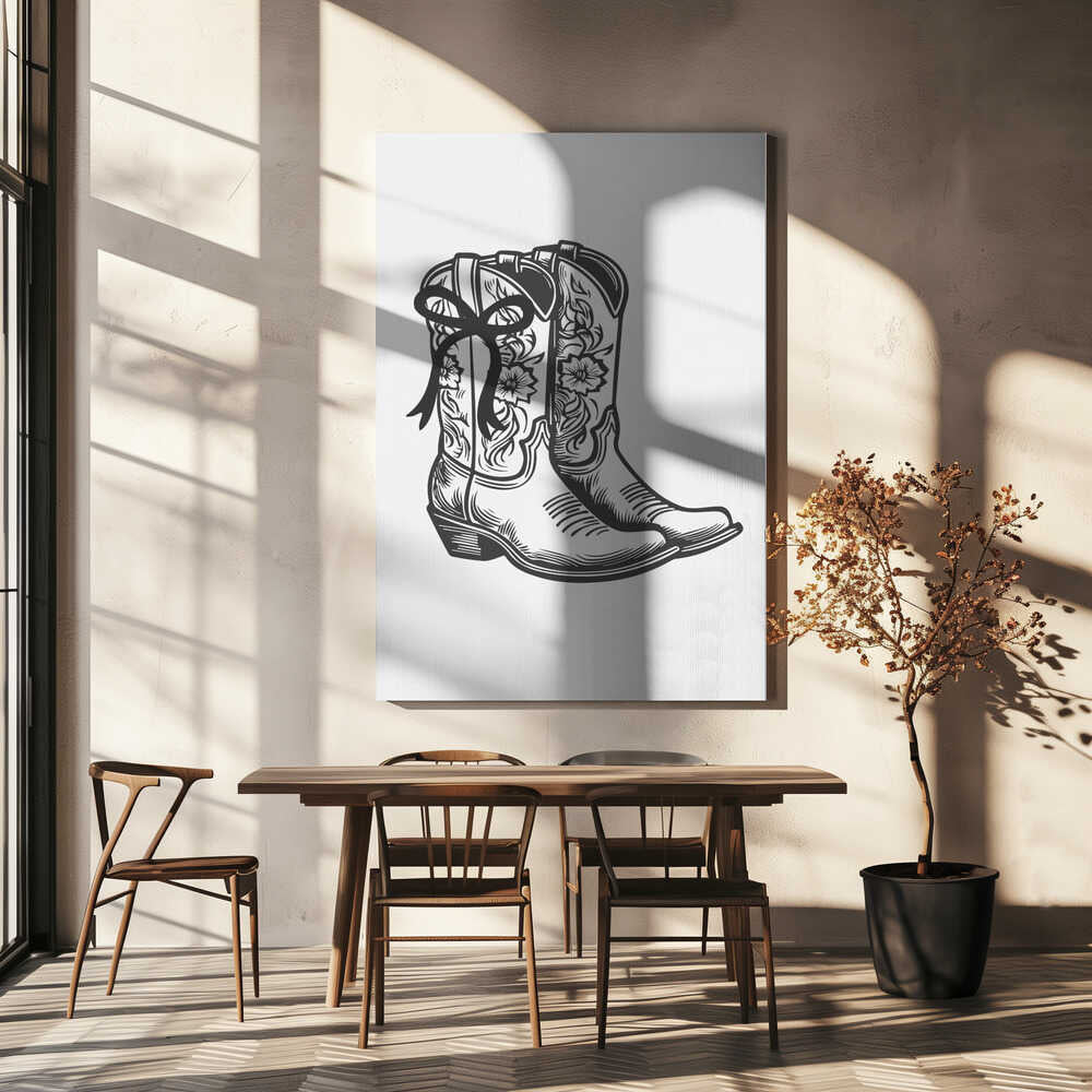 Tablou canvas „Black Cowgirl Boots with Bow” creat de Jolly and Dash, imprimat pe pânză de calitate, gata de agățat. Disponibil în mai multe dimensiuni. Perfect pentru orice spațiu.