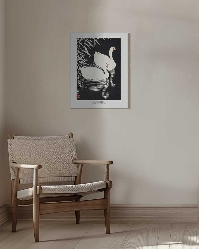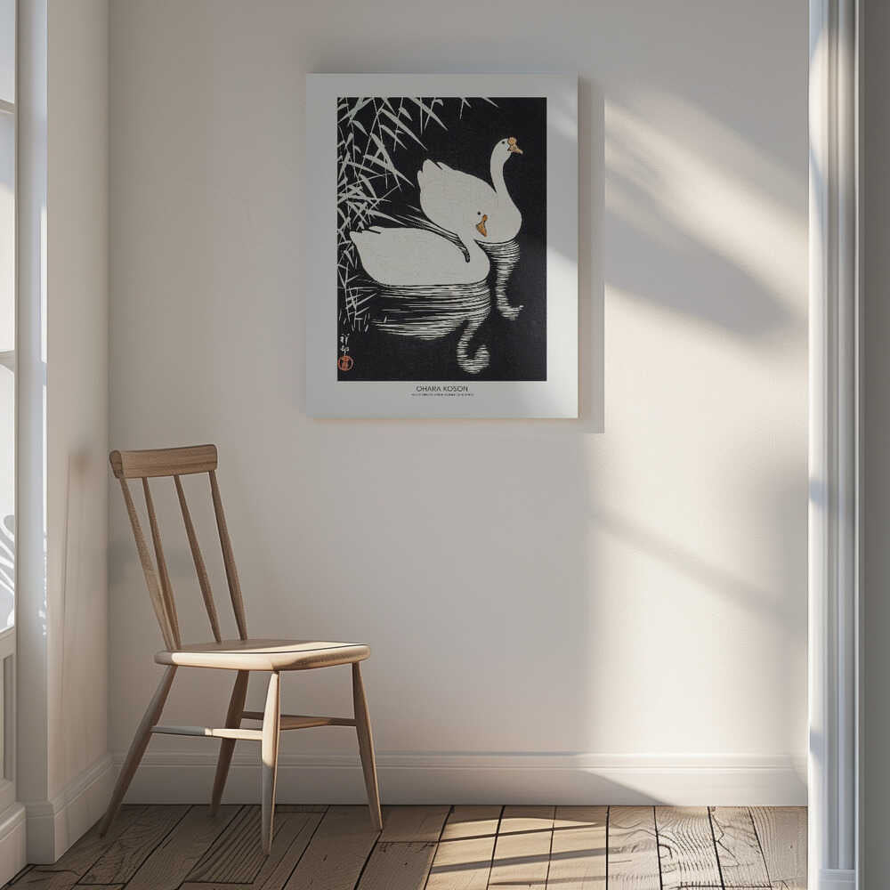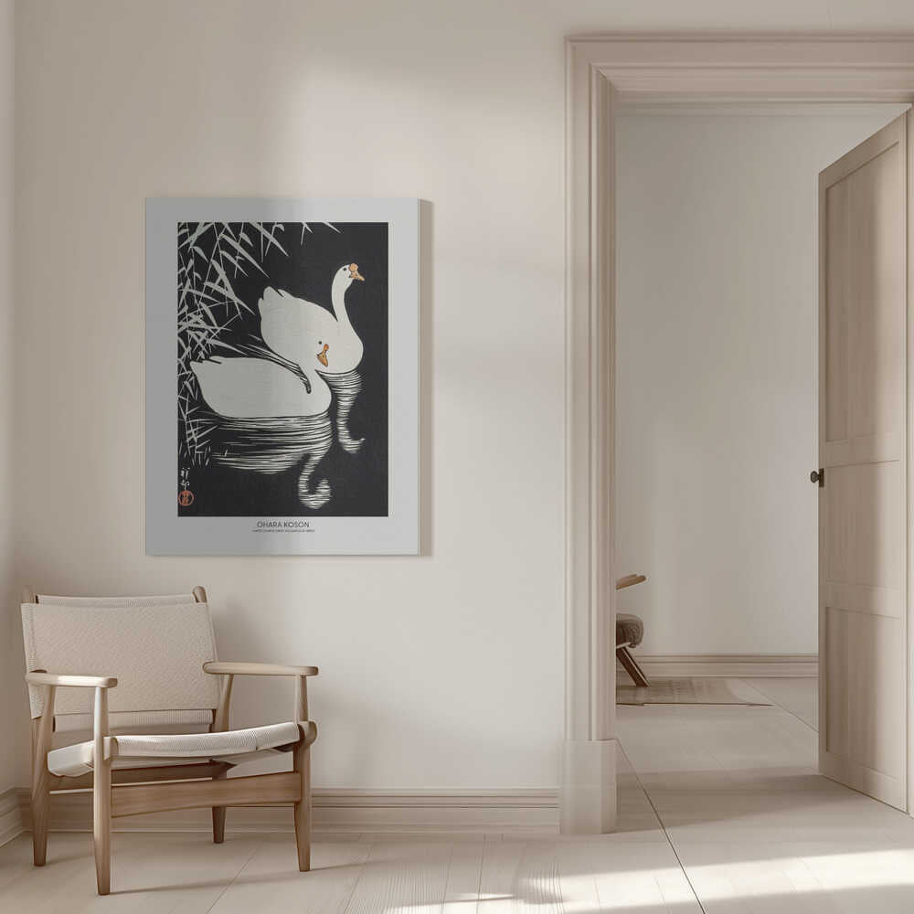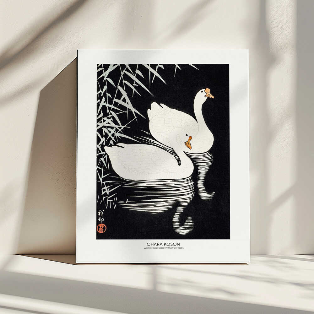 Tablou canvas „White Chinese Geese Swimming by Reeds” creat de Ohara Koson, imprimat pe pânză de calitate, gata de agățat. Disponibil în mai multe dimensiuni. Perfect pentru orice spațiu.