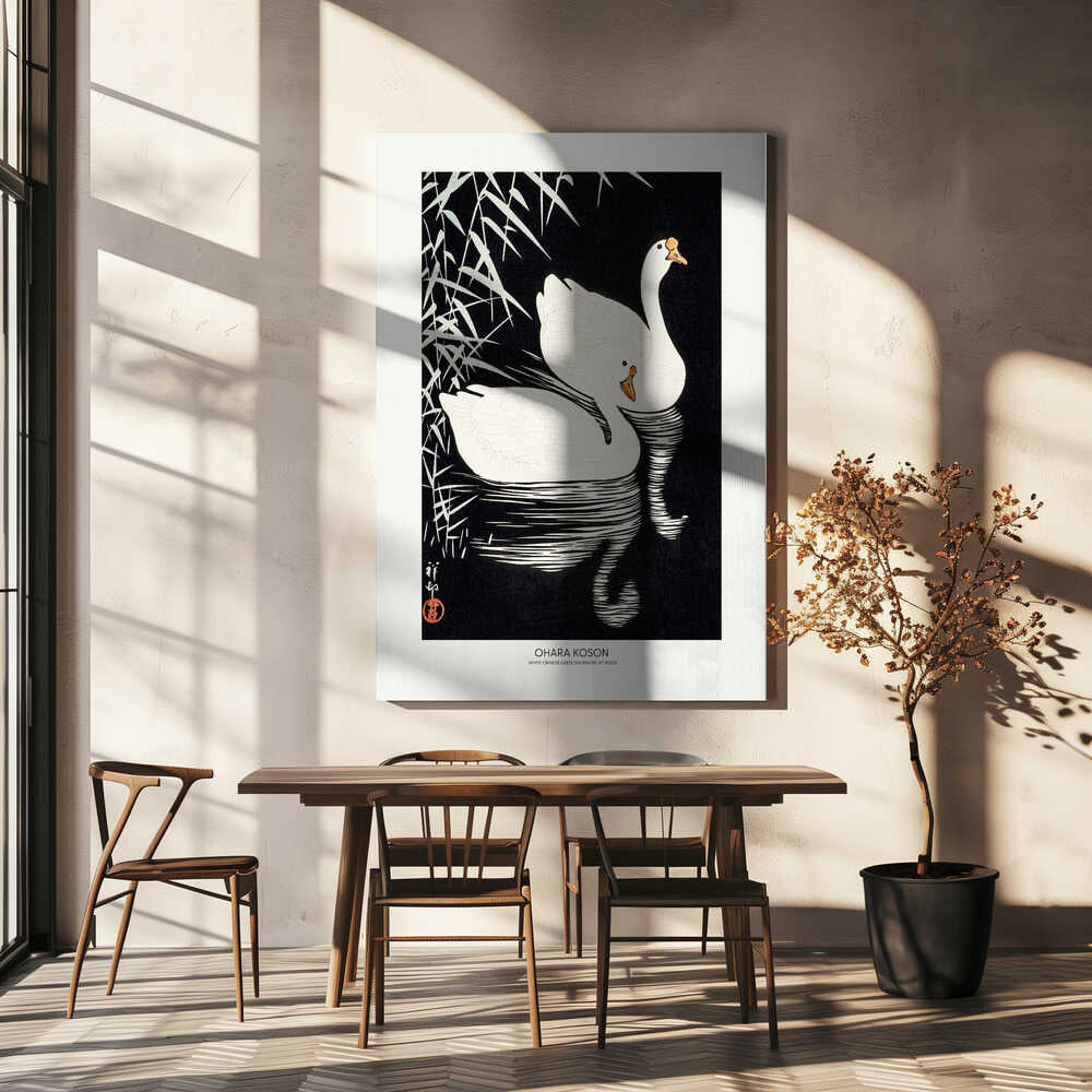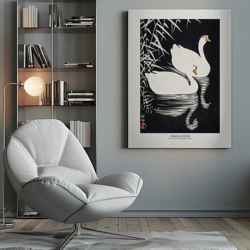Tablou canvas „White Chinese Geese Swimming by Reeds” de Ohara Koson