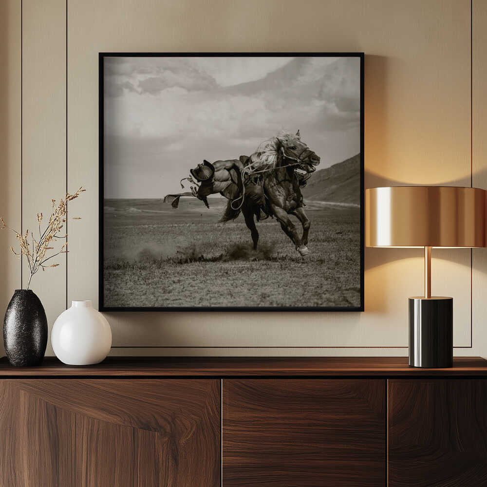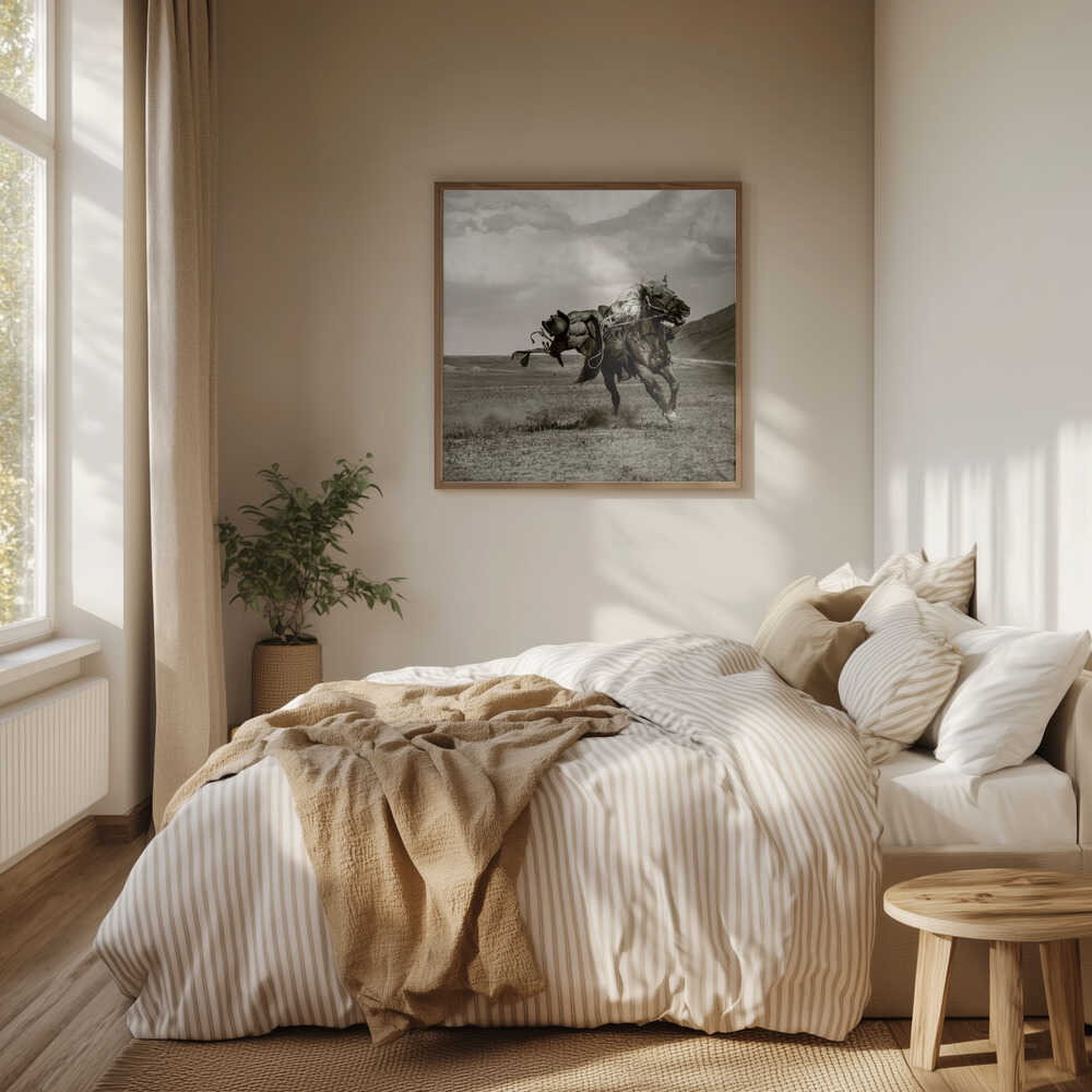 Tabloul înramat „Galloping”, creat de Rachel Pansky, este disponibil în mai multe dimensiuni, cu ramă neagră, albă sau din lemn natur. Se potrivește perfect în orice încăpere.