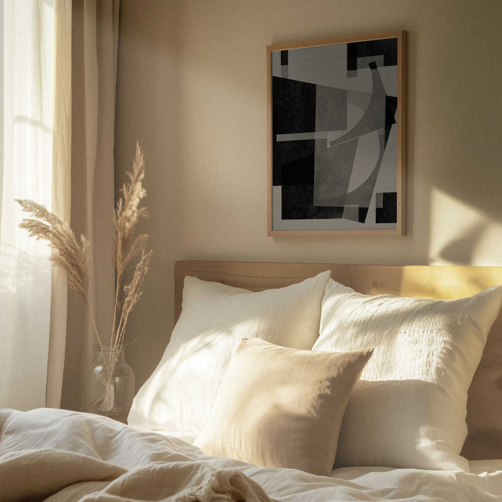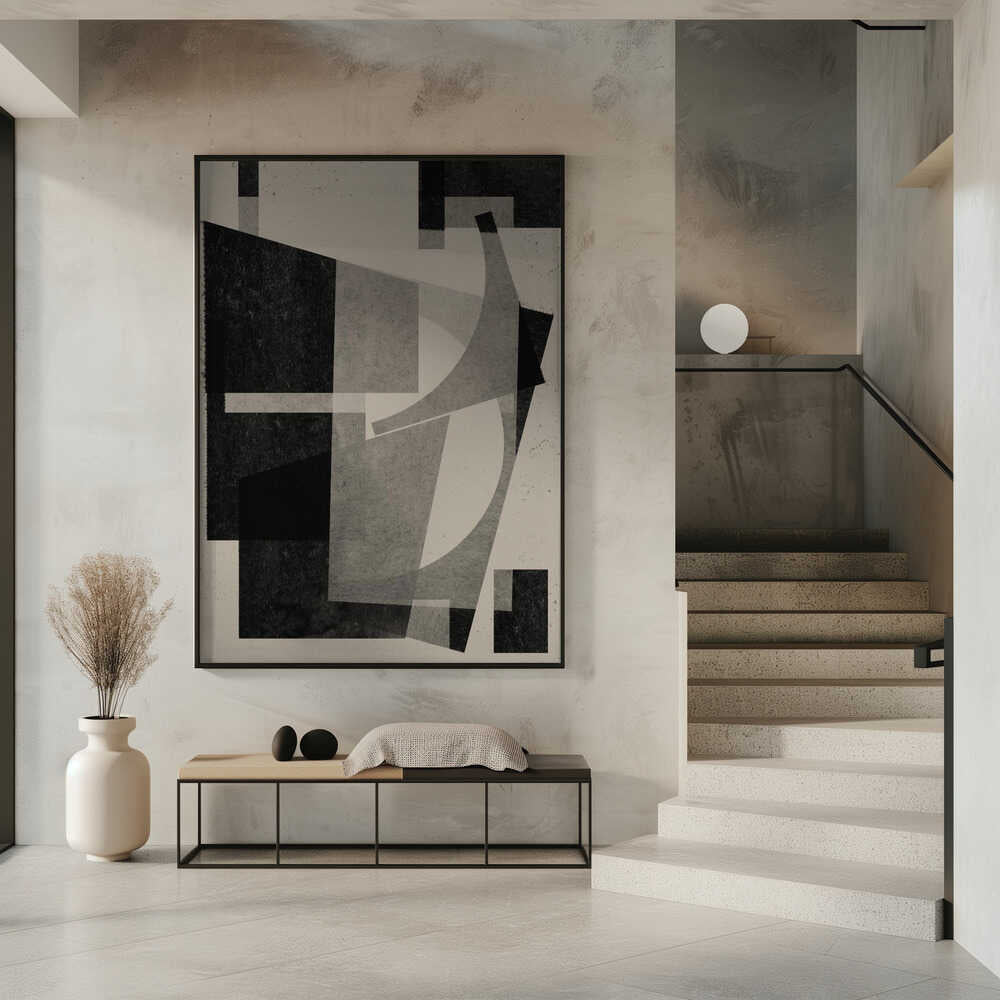 Tabloul înramat „Geometric Shadows”, creat de THE MIUUS STUDIO, este disponibil în mai multe dimensiuni, cu ramă neagră, albă sau din lemn natur. Se potrivește perfect în orice încăpere.