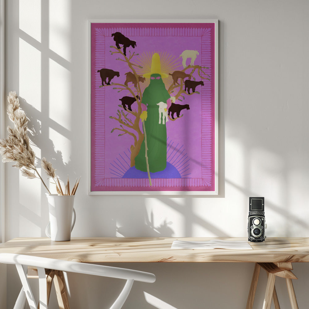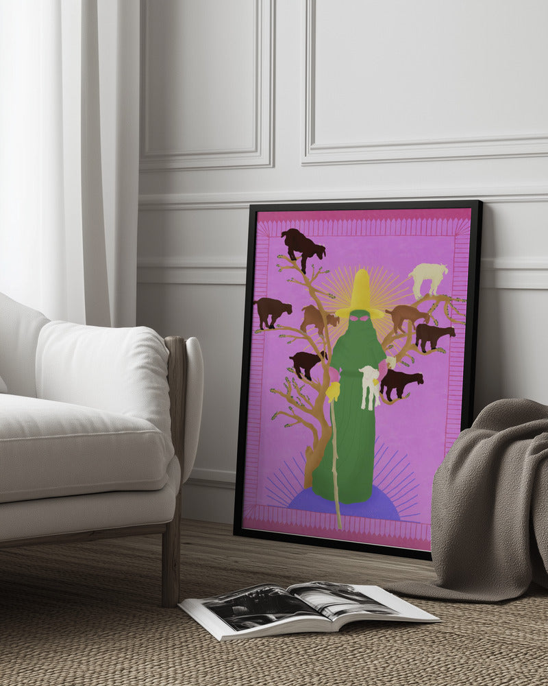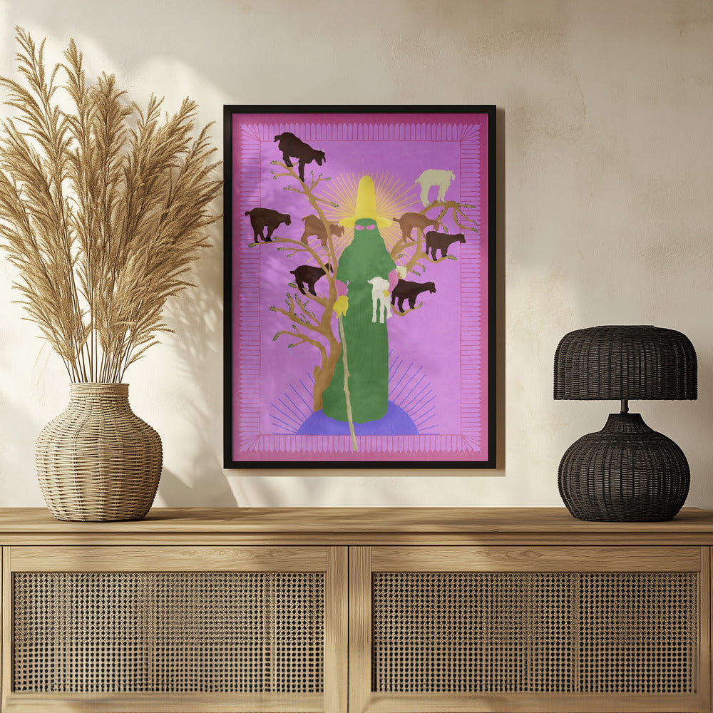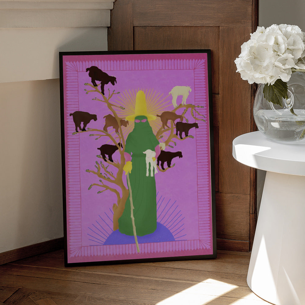 Tabloul înramat „Holy Woman Herder”, creat de Jota de jai, este disponibil în mai multe dimensiuni, cu ramă neagră, albă sau din lemn natur. Se potrivește perfect în orice încăpere.