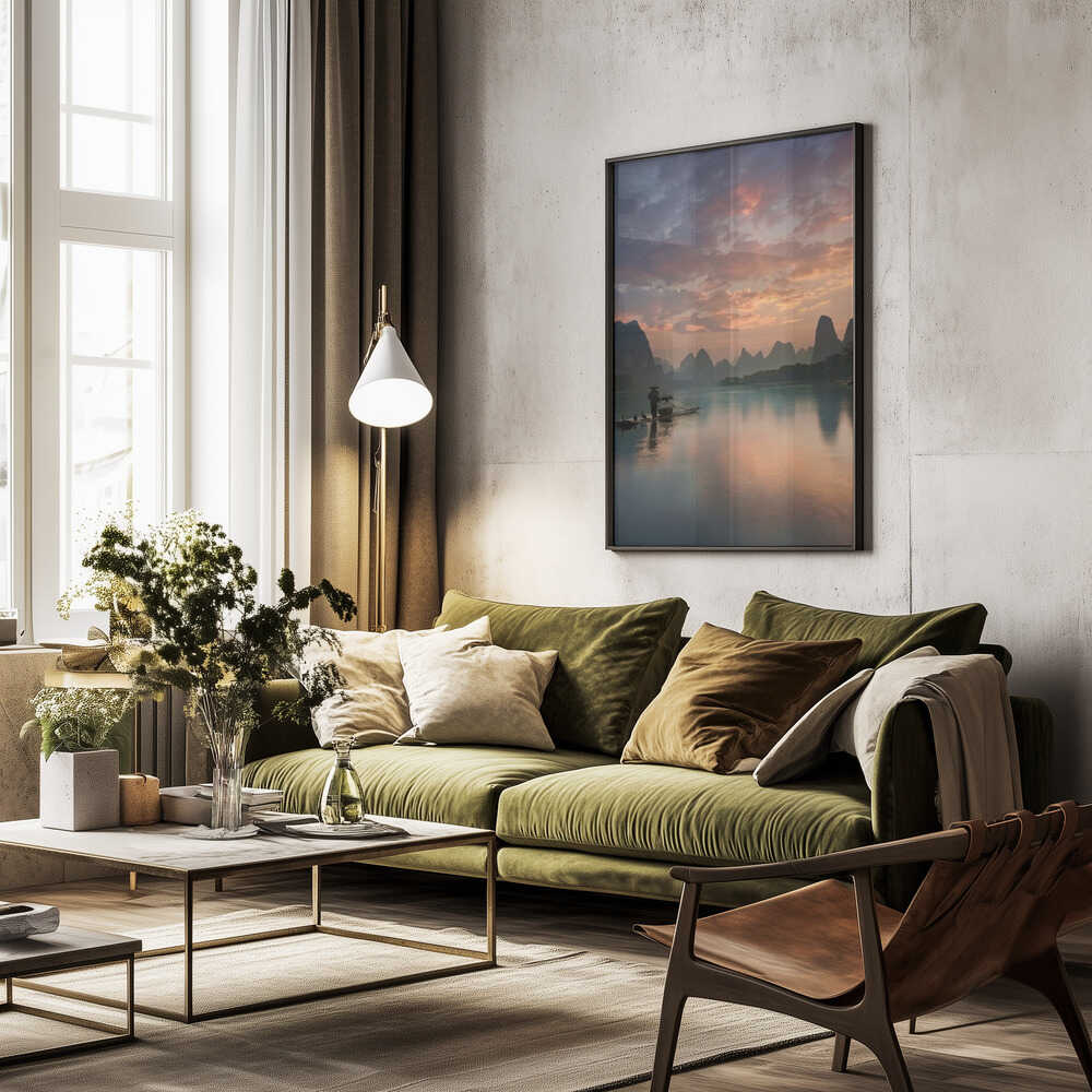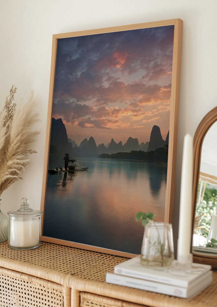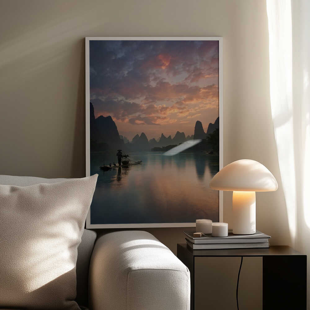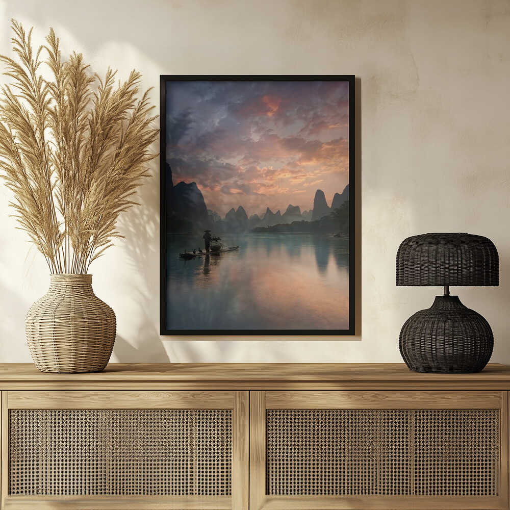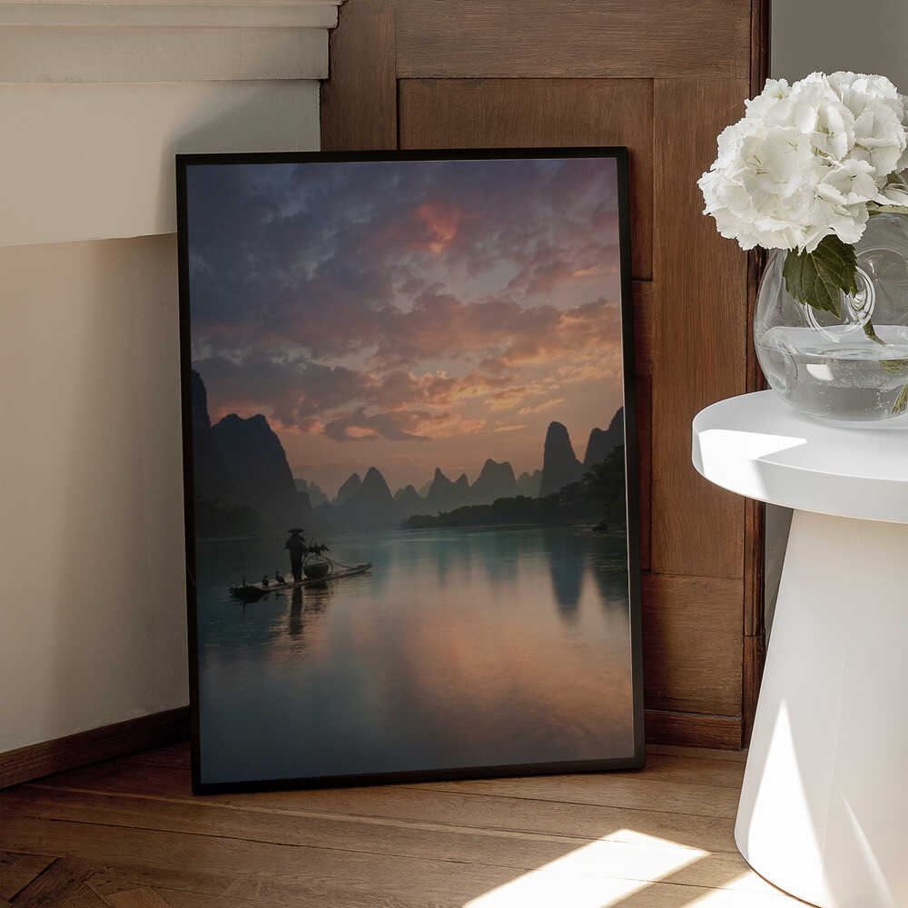 Tabloul înramat „Li River Sunrise”, creat de Yan Zhang, este disponibil în mai multe dimensiuni, cu ramă neagră, albă sau din lemn natur. Se potrivește perfect în orice încăpere.