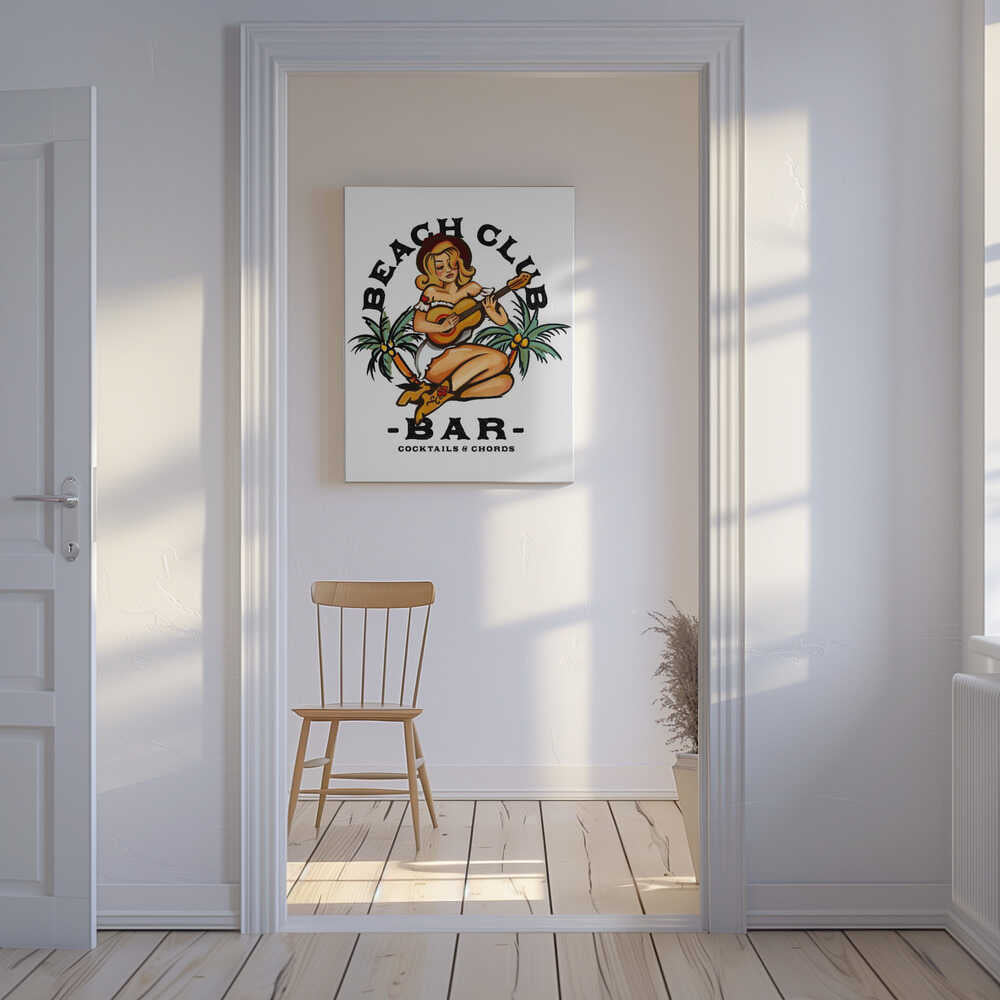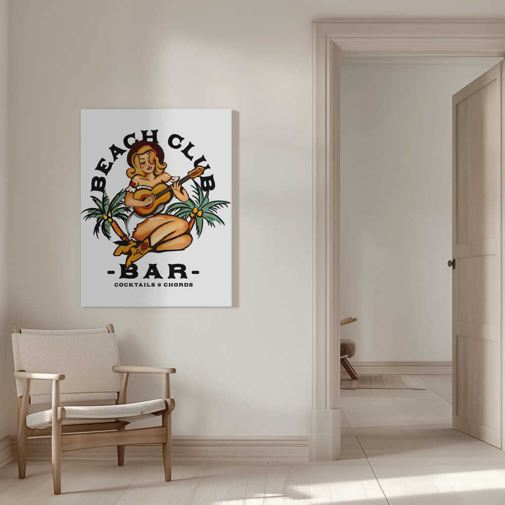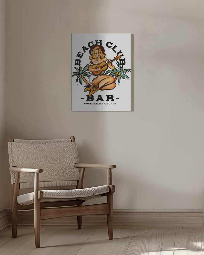 Tablou canvas „Beach Club Bar. Sailor Jerry Style Pin-up Girl Playing Guitar” creat de The Whiskey Ginger, imprimat pe pânză de calitate, gata de agățat. Disponibil în mai multe dimensiuni. Perfect pentru orice spațiu.