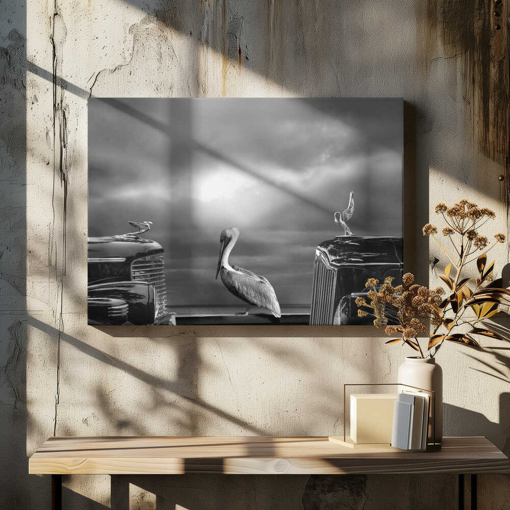 Tablou canvas „COMTEMPLATING THE PELICAN” de LARRY BUTTERWORTH