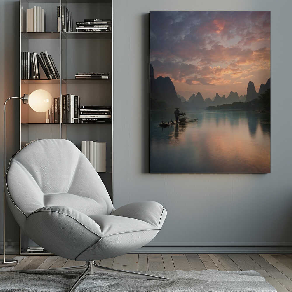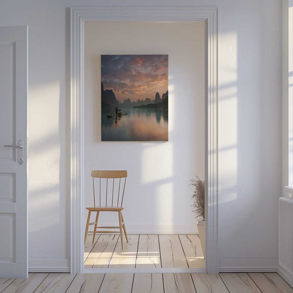 Tablou canvas „Li River Sunrise” creat de Yan Zhang, imprimat pe pânză de calitate, gata de agățat. Disponibil în mai multe dimensiuni. Perfect pentru orice spațiu.