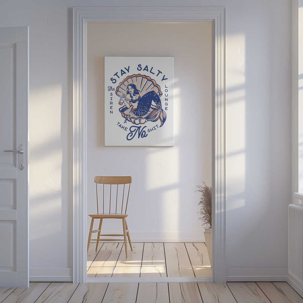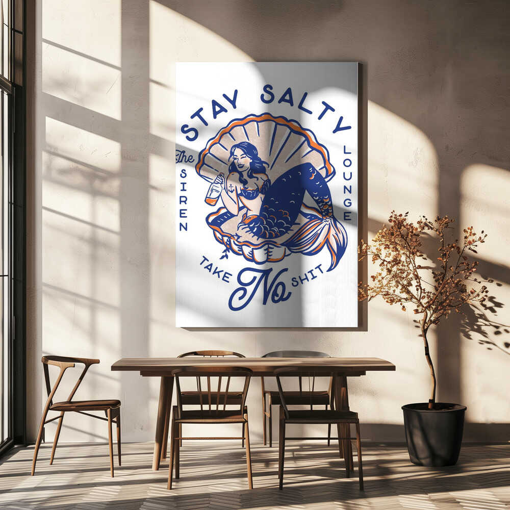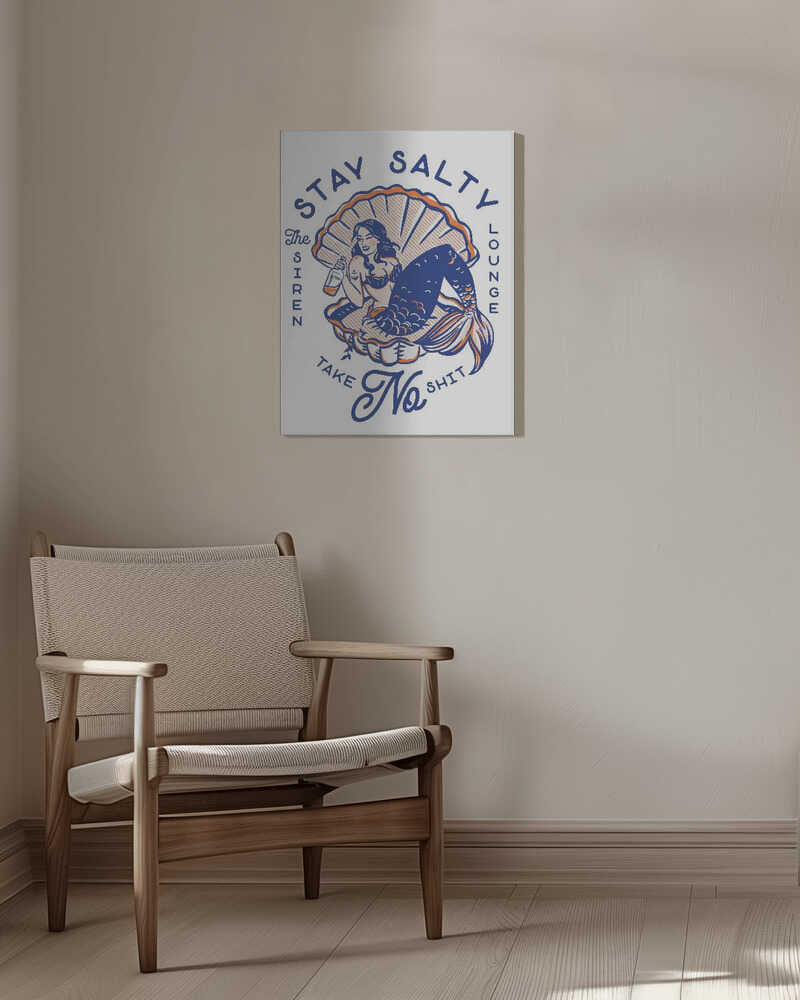 Tablou canvas „Stay Salty Siren Lounge Pin-Up Mermaid” creat de The Whiskey Ginger, imprimat pe pânză de calitate, gata de agățat. Disponibil în mai multe dimensiuni. Perfect pentru orice spațiu.