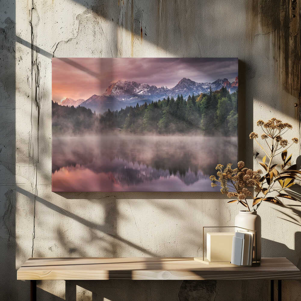 Tablou canvas „Sunrise at the Lake” creat de Andreas Wonisch, imprimat pe pânză de calitate, gata de agățat. Disponibil în mai multe dimensiuni. Perfect pentru orice spațiu.