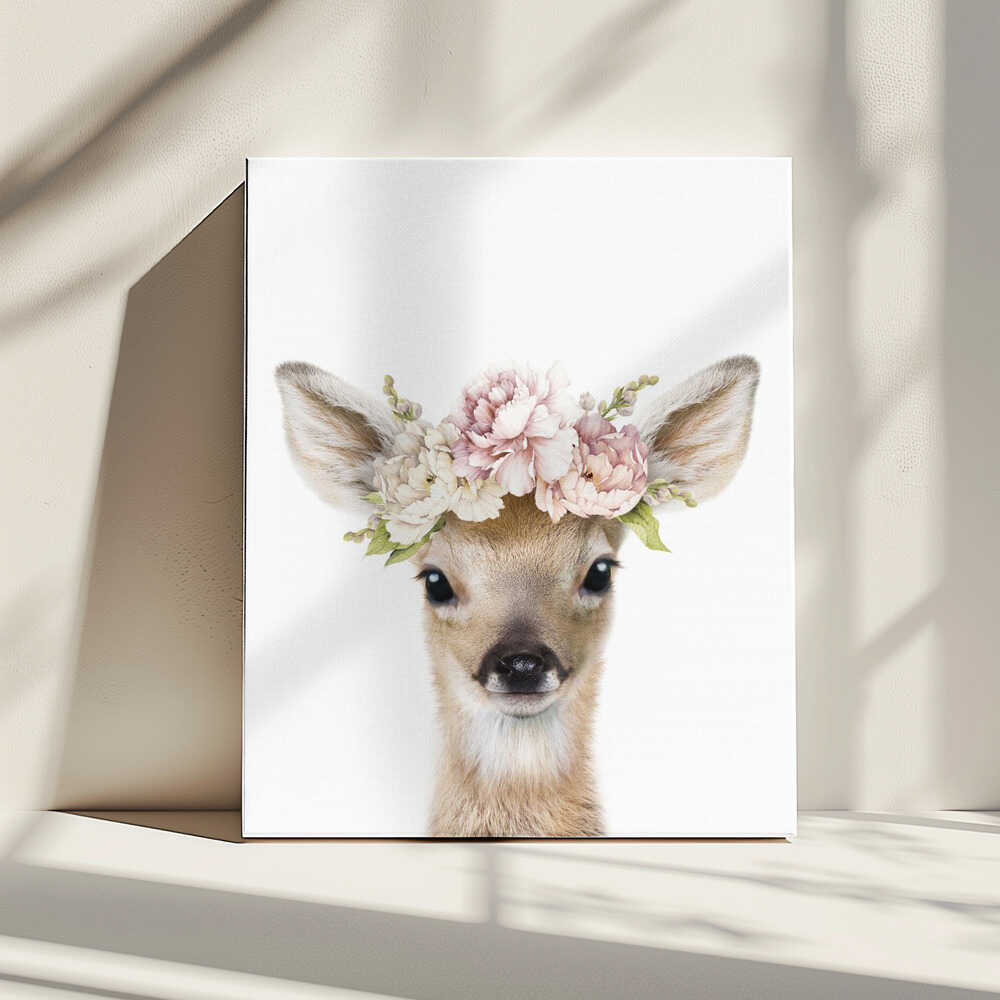 Tablou canvas „Floral Baby Deer” creat de Lola Peacock, imprimat pe pânză de calitate, gata de agățat. Disponibil în mai multe dimensiuni. Perfect pentru orice spațiu.
