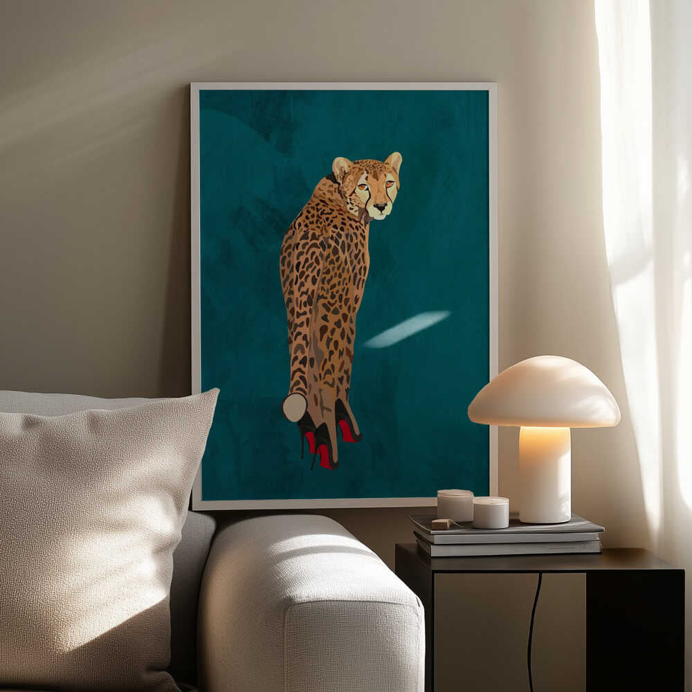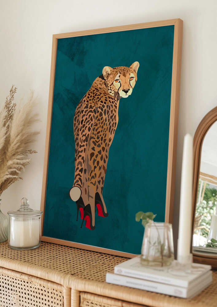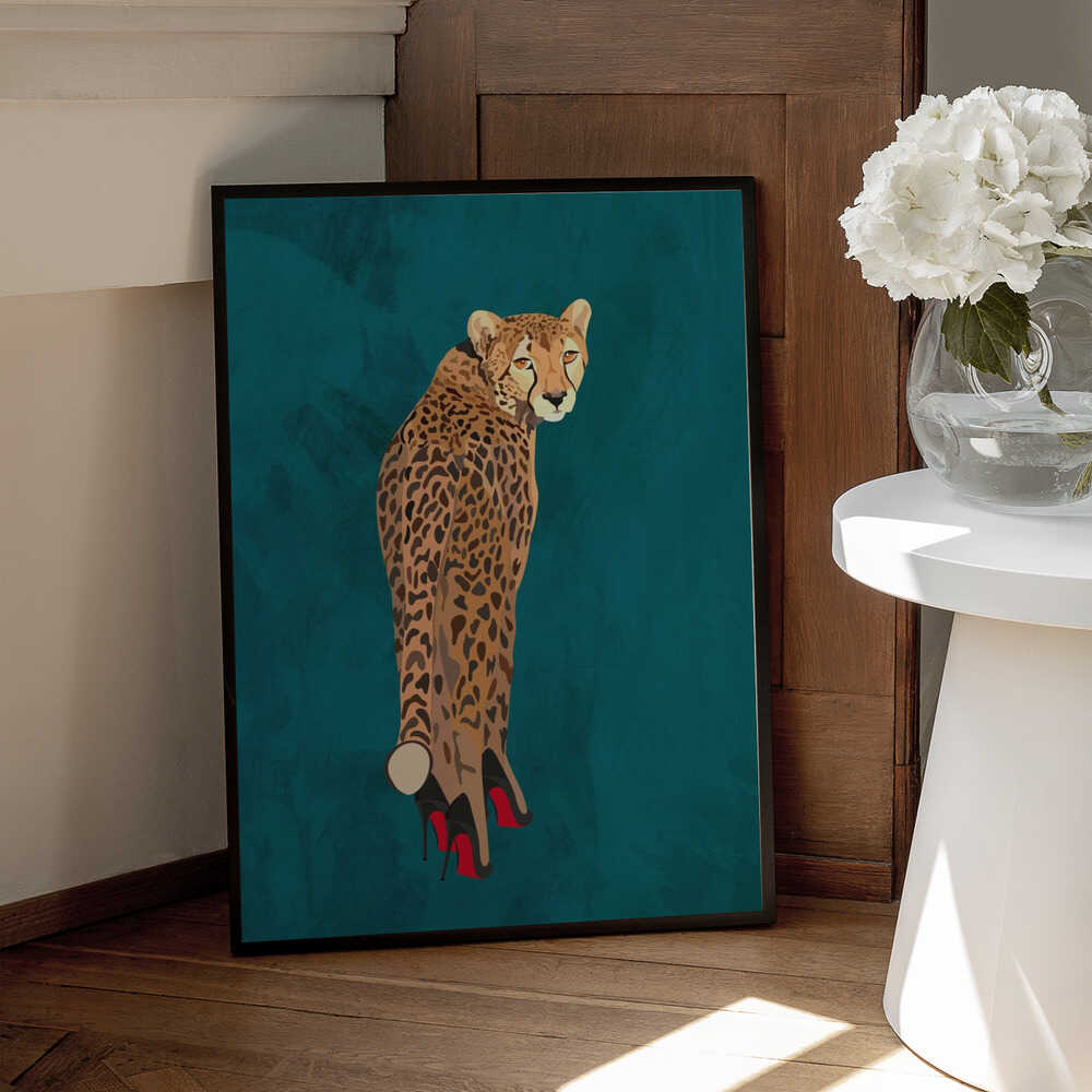 Tabloul înramat „Turquoise cheetah in heels”, creat de Sarah Manovski, este disponibil în mai multe dimensiuni, cu ramă neagră, albă sau din lemn natur. Se potrivește perfect în orice încăpere.