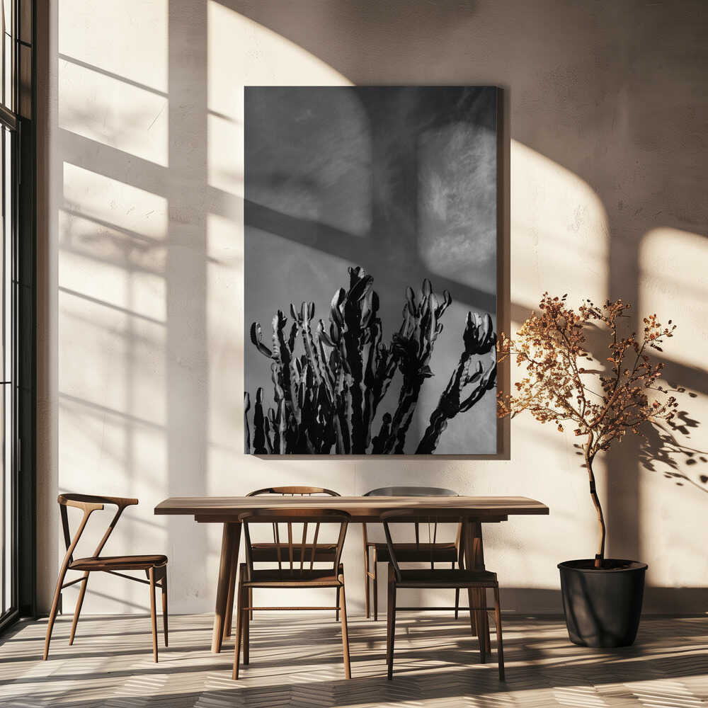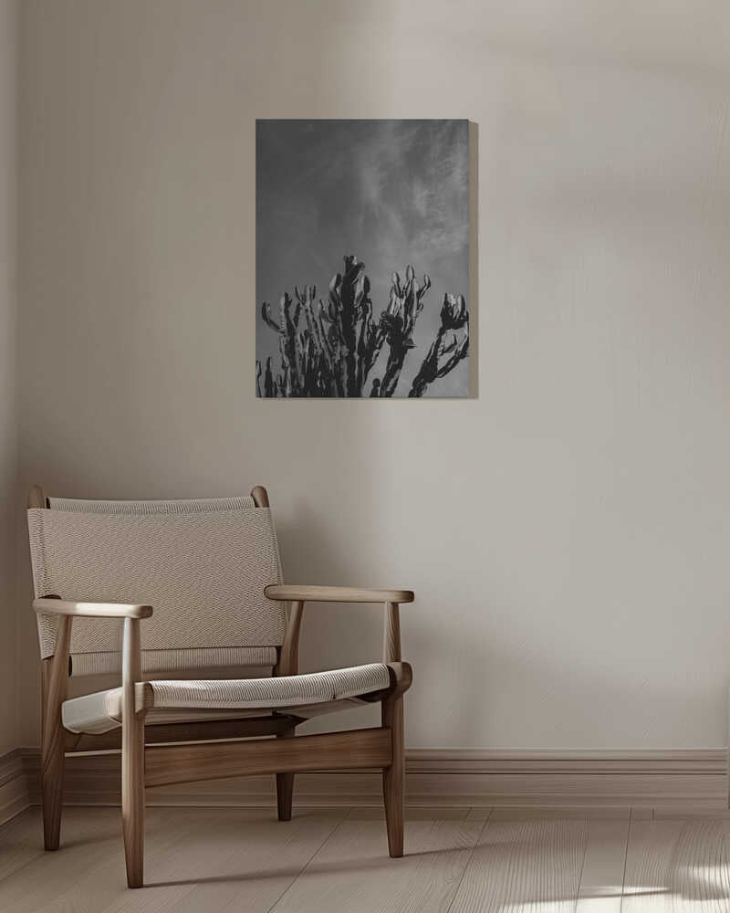 Tablou canvas „Monochrome Cactus Sky” creat de Bethany Young, imprimat pe pânză de calitate, gata de agățat. Disponibil în mai multe dimensiuni. Perfect pentru orice spațiu.