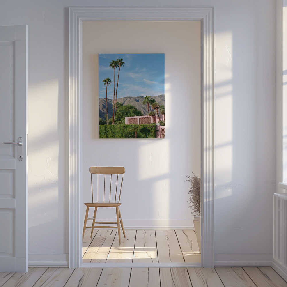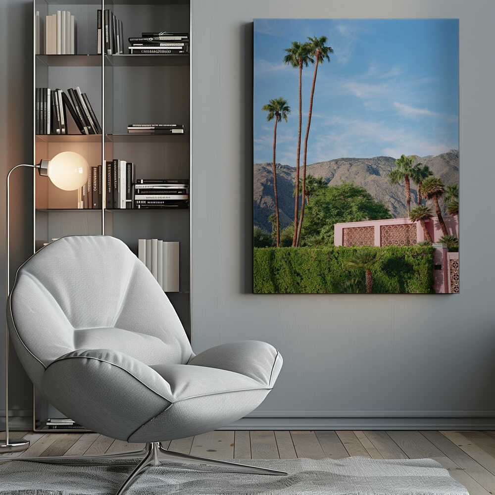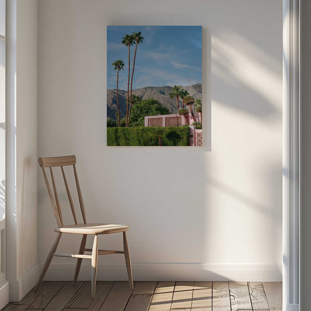 Tablou canvas „Palm Springs Pink House” creat de Bethany Young, imprimat pe pânză de calitate, gata de agățat. Disponibil în mai multe dimensiuni. Perfect pentru orice spațiu.