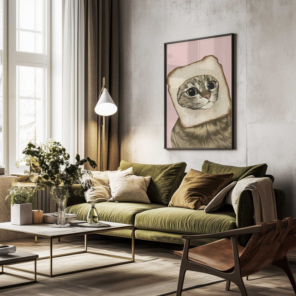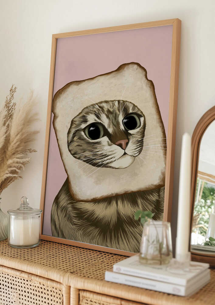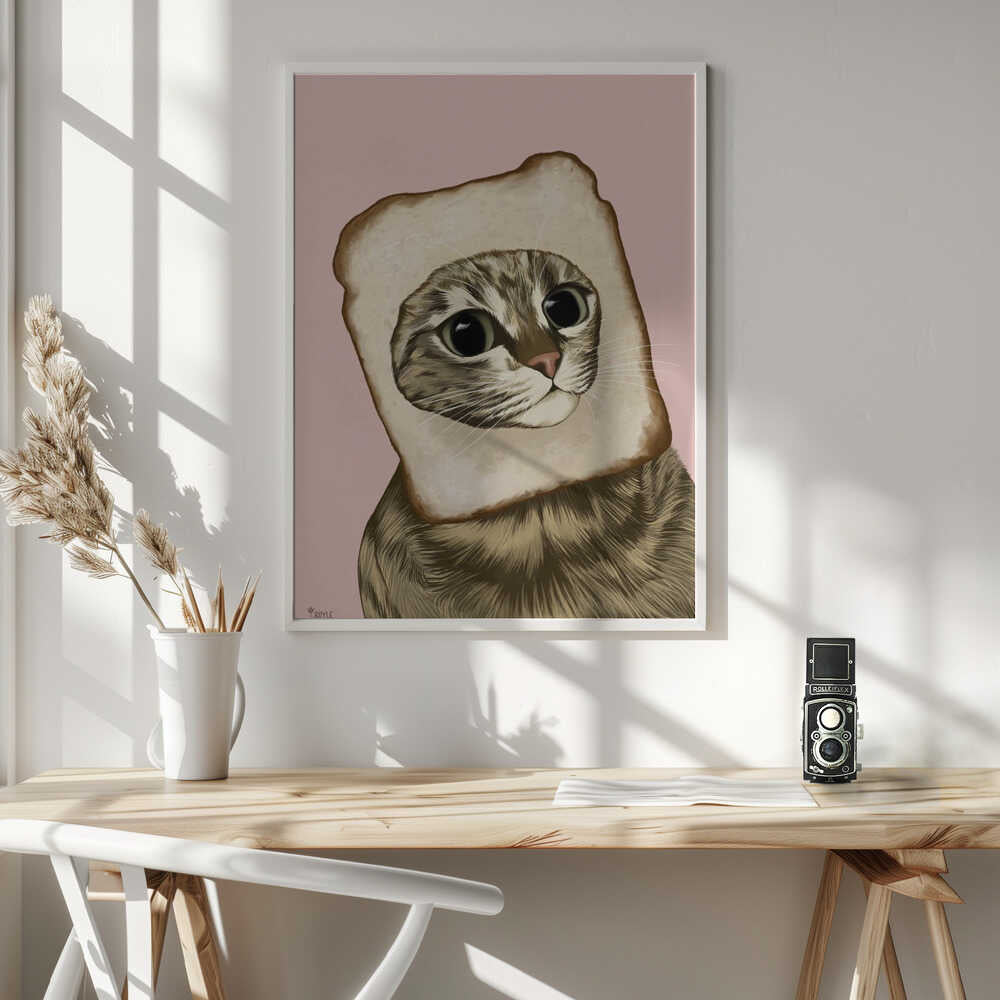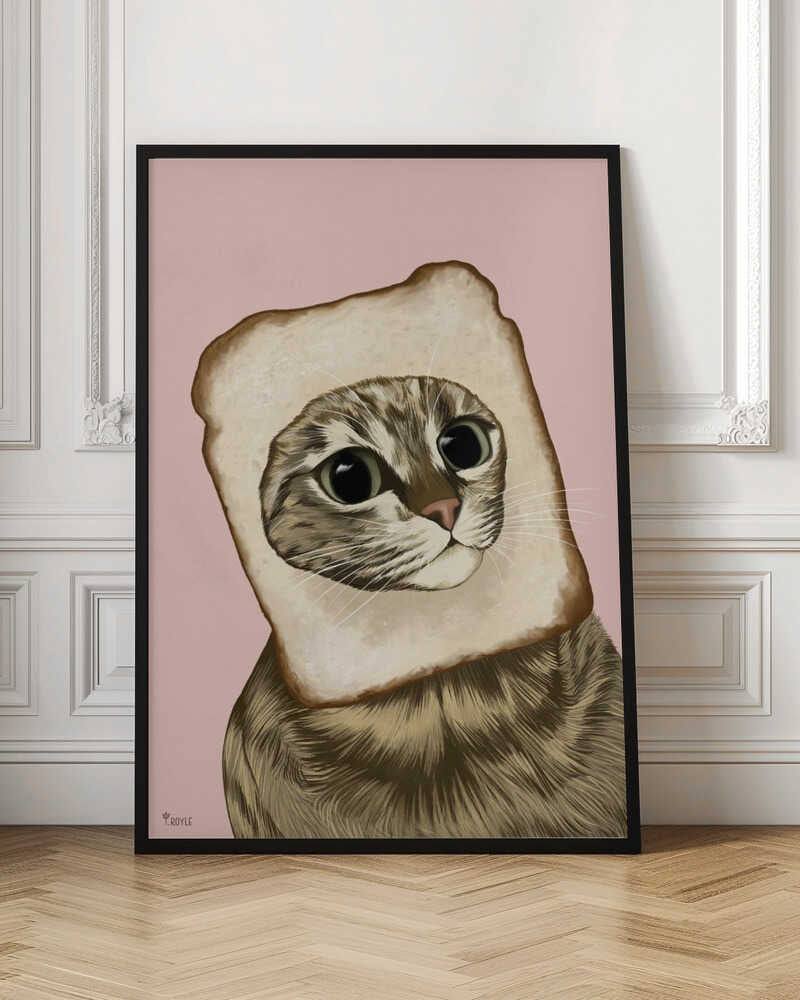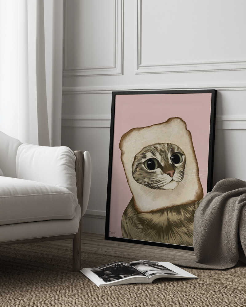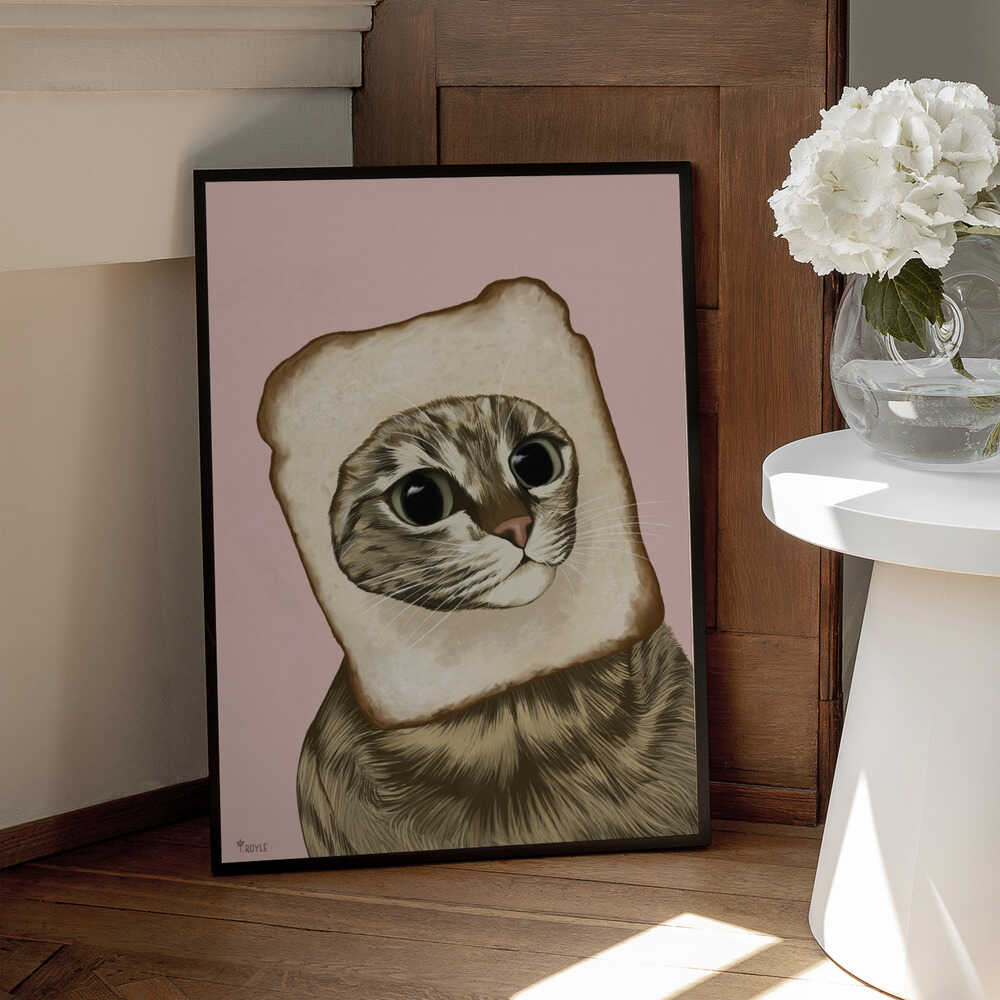 Tabloul înramat „Bread Meme Cat”, creat de Tara Royle, este disponibil în mai multe dimensiuni, cu ramă neagră, albă sau din lemn natur. Se potrivește perfect în orice încăpere.