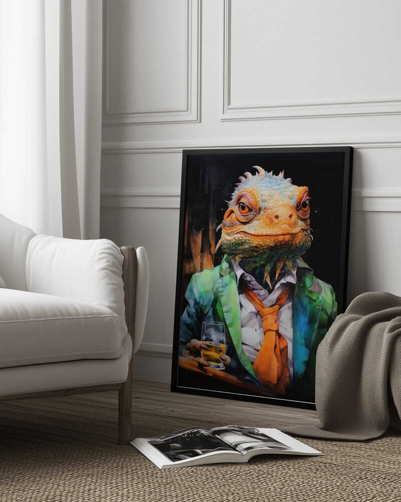 Tabloul înramat „Chameleon Watercolor Animal Art”, creat de Justyna Jaszke, este disponibil în mai multe dimensiuni, cu ramă neagră, albă sau din lemn natur. Se potrivește perfect în orice încăpere.