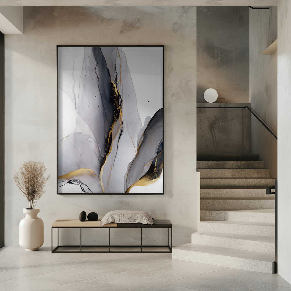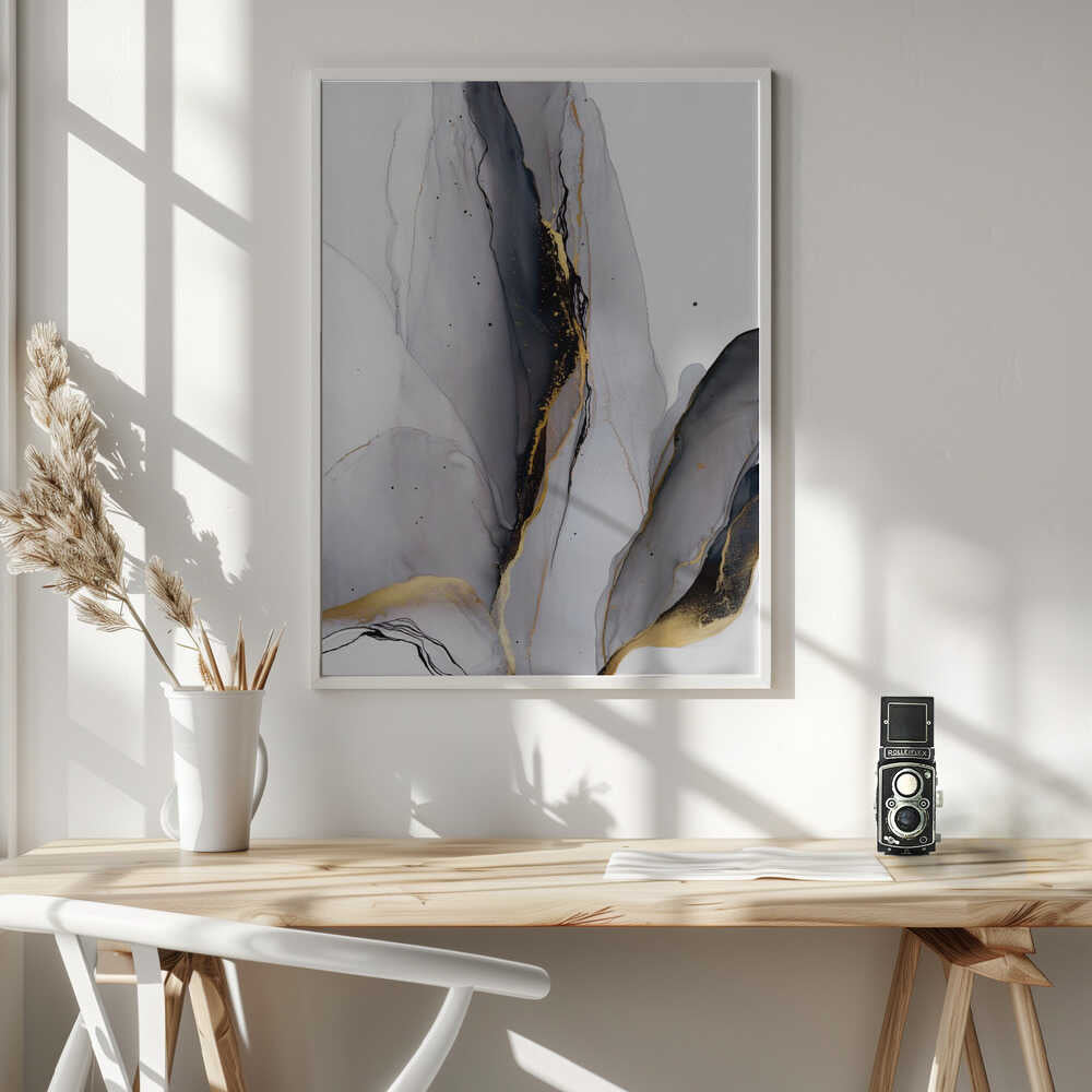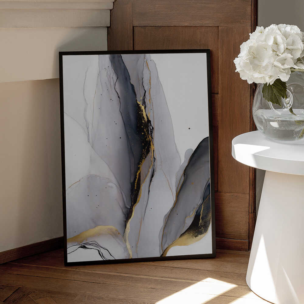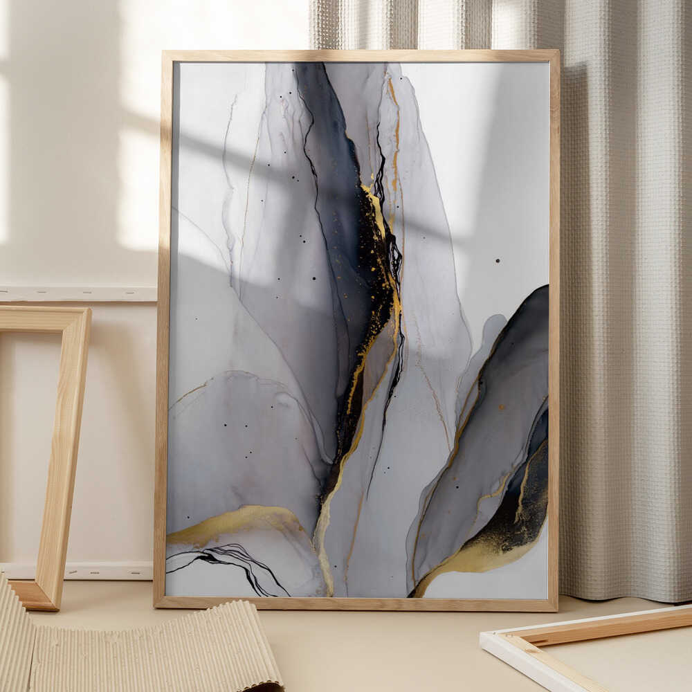Tabloul înramat „Golden Veins Flow”, creat de Alevtina Shelest, este disponibil în mai multe dimensiuni, cu ramă neagră, albă sau din lemn natur. Se potrivește perfect în orice încăpere.