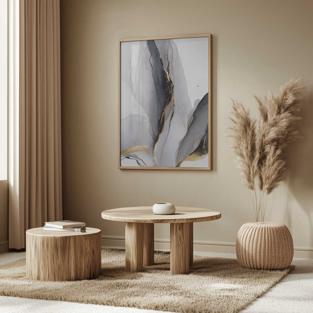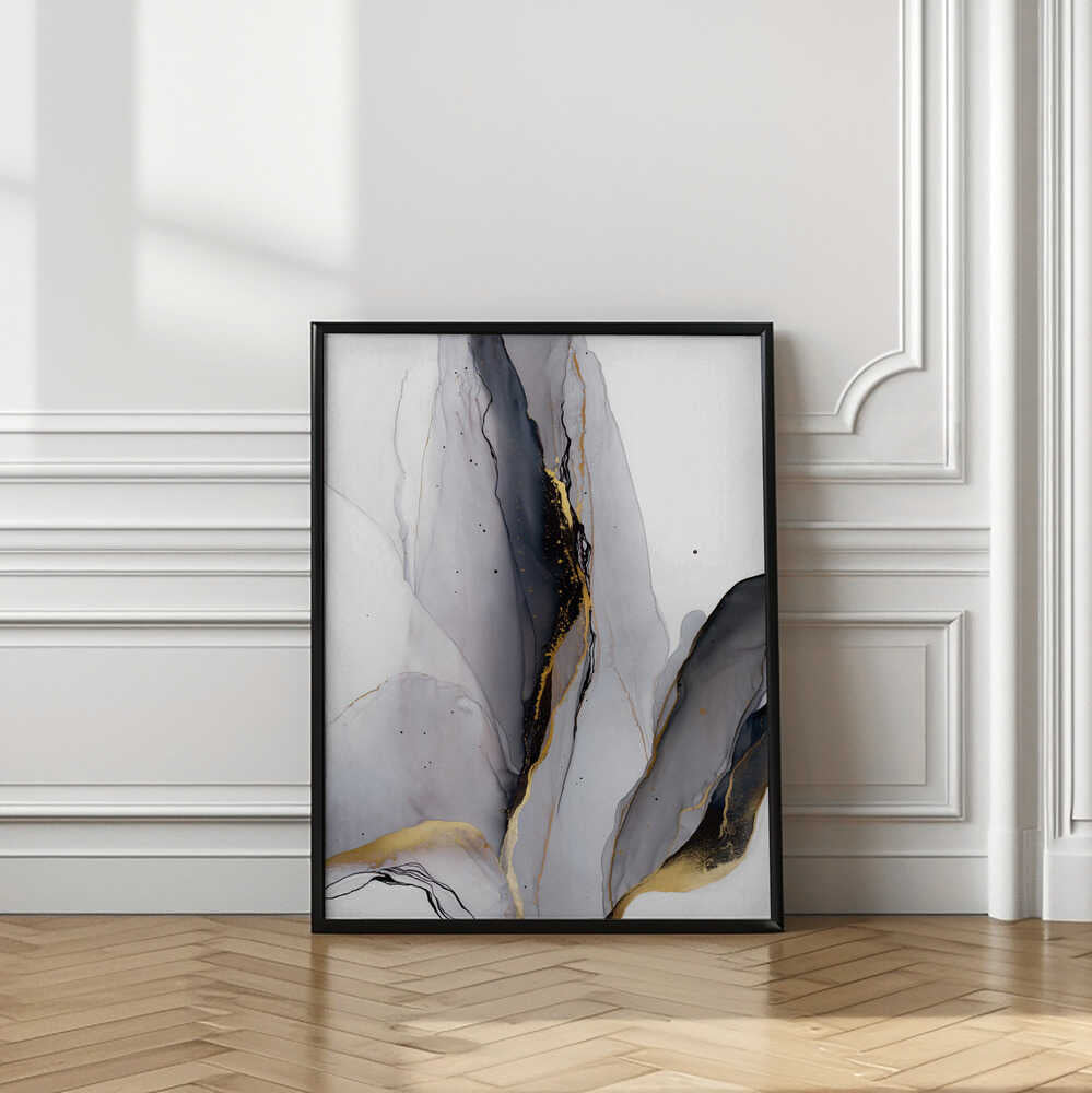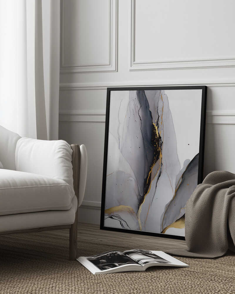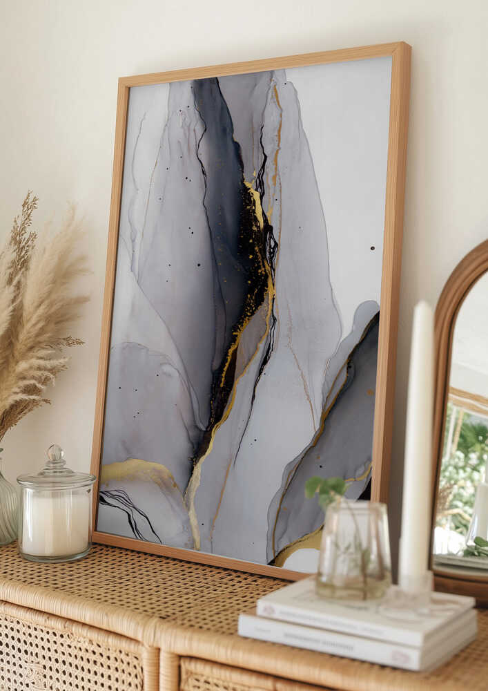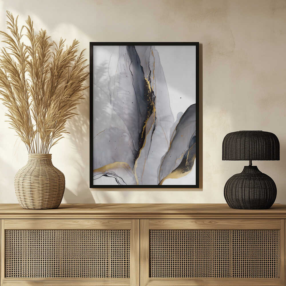 Tabloul înramat „Golden Veins Flow”, creat de Alevtina Shelest, este disponibil în mai multe dimensiuni, cu ramă neagră, albă sau din lemn natur. Se potrivește perfect în orice încăpere.