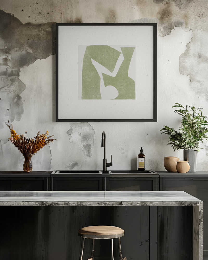 Tabloul înramat „Green Geometric Harmony”, creat de THE MIUUS STUDIO, este disponibil în mai multe dimensiuni, cu ramă neagră, albă sau din lemn natur. Se potrivește perfect în orice încăpere.
