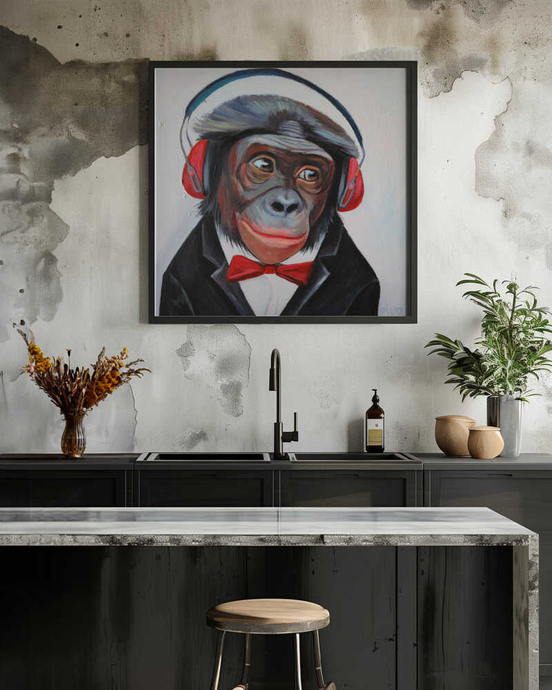 Tabloul înramat „Groovy Primate Tunes”, creat de Violeta Vollmer, este disponibil în mai multe dimensiuni, cu ramă neagră, albă sau din lemn natur. Se potrivește perfect în orice încăpere.