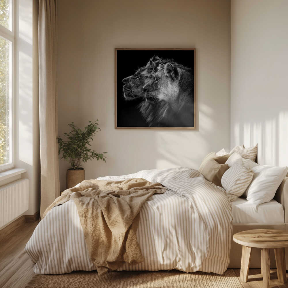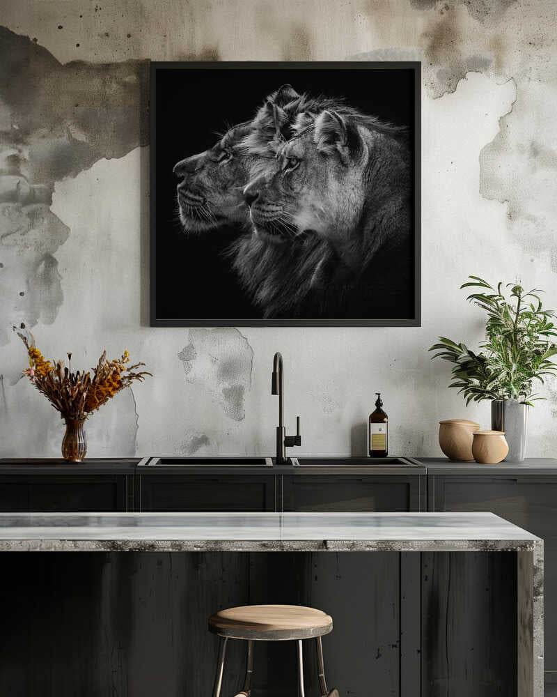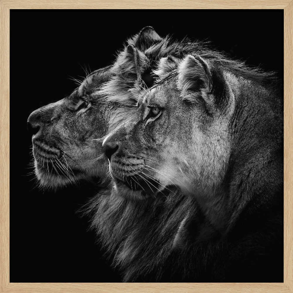 Tabloul înramat „Lion and lioness portrait”, creat de Laurent Lothare Dambreville, este disponibil în mai multe dimensiuni, cu ramă neagră, albă sau din lemn natur. Se potrivește perfect în orice încăpere.