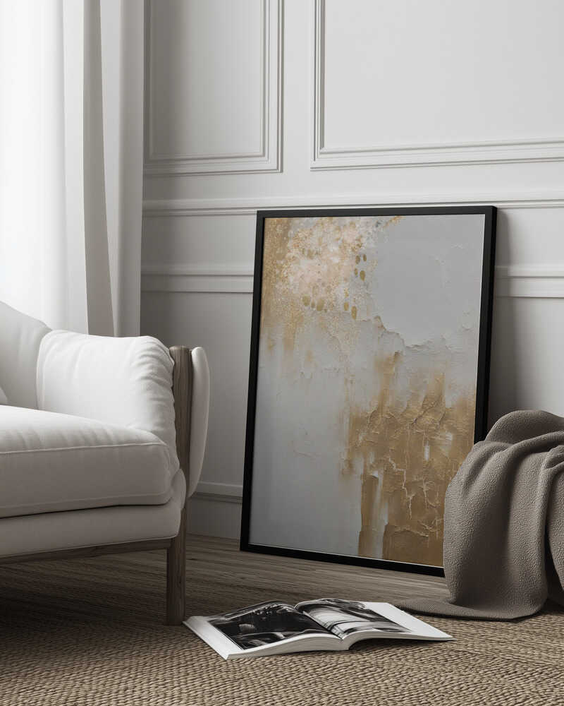 Tabloul înramat „Marble in Gold”, creat de Sally Ann Moss, este disponibil în mai multe dimensiuni, cu ramă neagră, albă sau din lemn natur. Se potrivește perfect în orice încăpere.