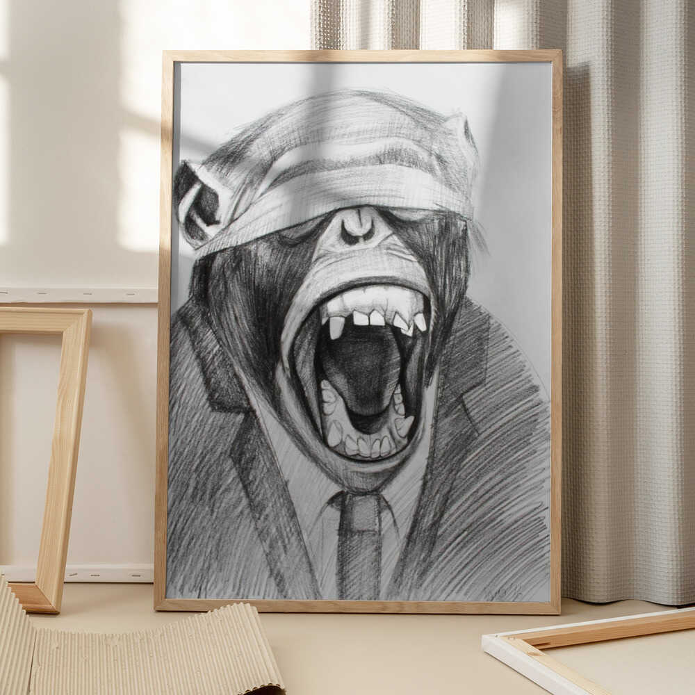 Tabloul înramat „Monkey In A Suited Attire With A Blindfold”, creat de Violeta Vollmer, este disponibil în mai multe dimensiuni, cu ramă neagră, albă sau din lemn natur. Se potrivește perfect în orice încăpere.