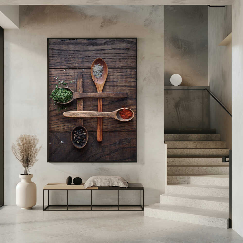 Tabloul înramat „Wooden Spoons With Colorful Spices”, creat de Karina Aleksandrova, este disponibil în mai multe dimensiuni, cu ramă neagră, albă sau din lemn natur. Se potrivește perfect în orice încăpere.