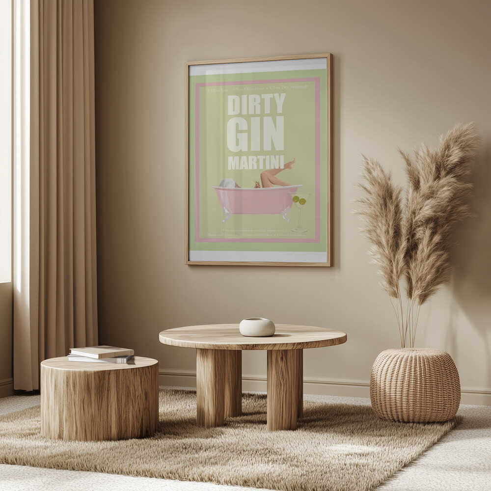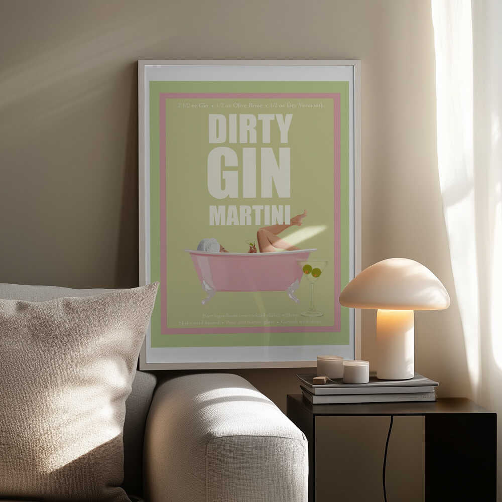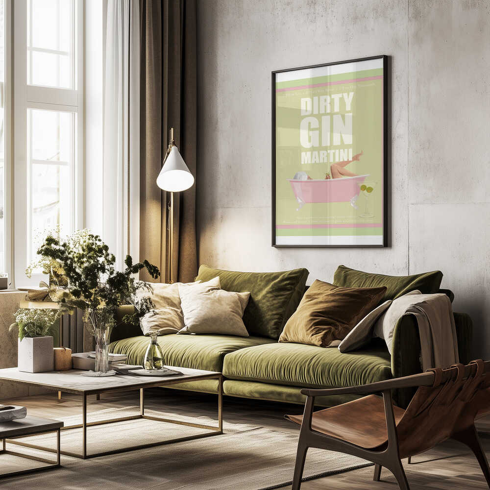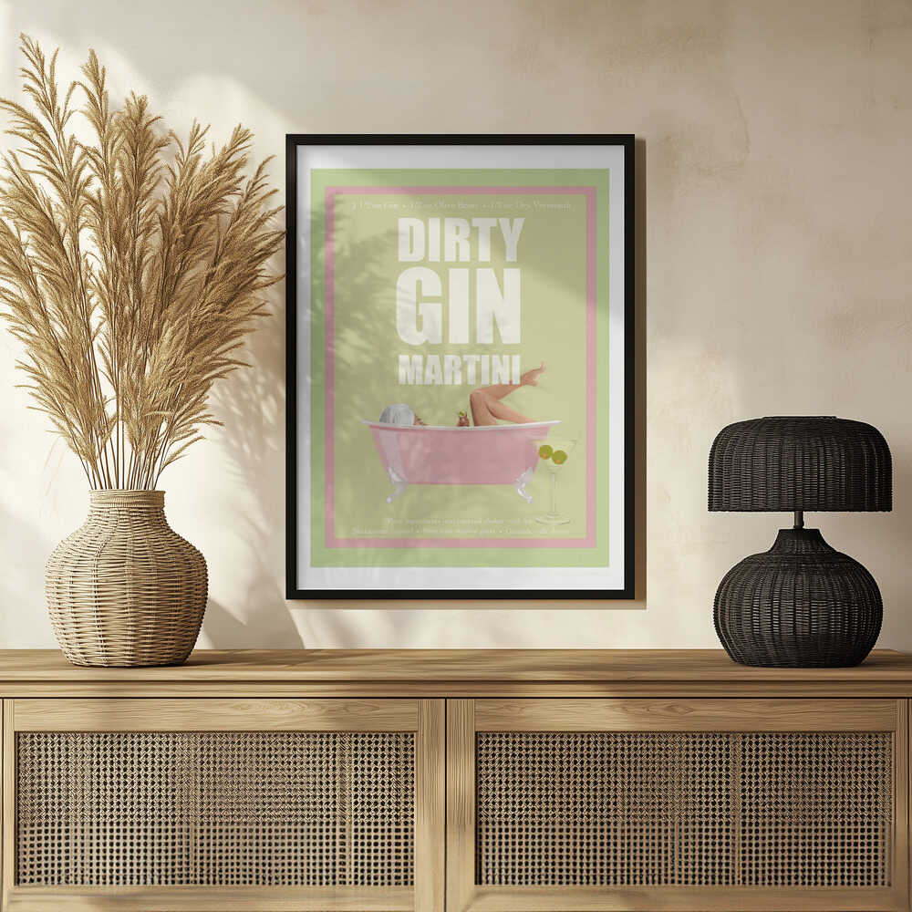 Tabloul înramat „Jlr Cocktails- Dirty Gin Martini”, creat de Jenny Liz Rome, este disponibil în mai multe dimensiuni, cu ramă neagră, albă sau din lemn natur. Se potrivește perfect în orice încăpere.