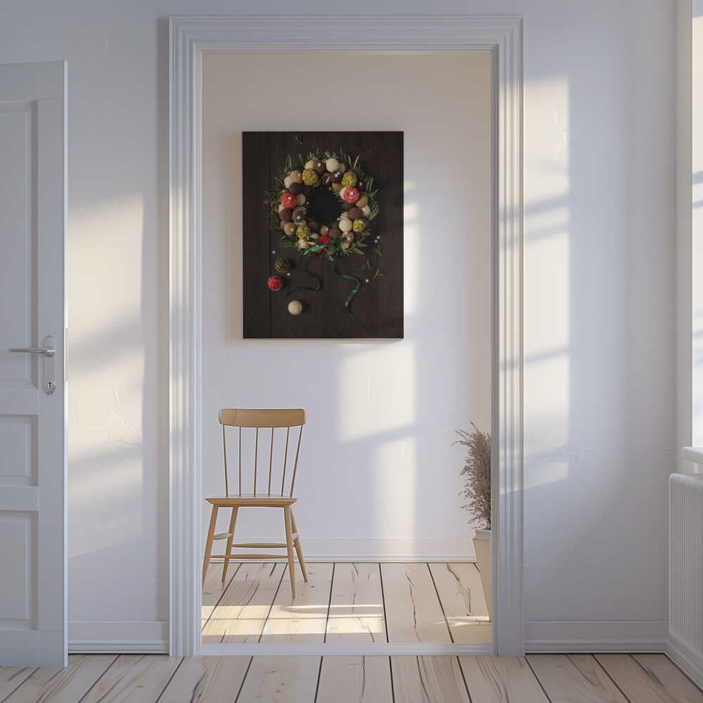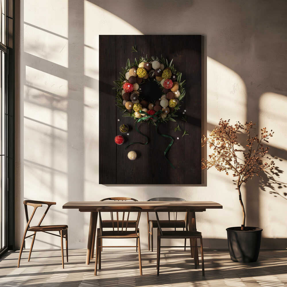 Tablou canvas „Truffles Christmas wreath” creat de Diana Popescu, imprimat pe pânză de calitate, gata de agățat. Disponibil în mai multe dimensiuni. Perfect pentru orice spațiu.