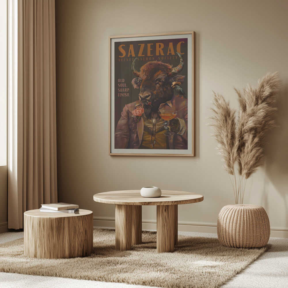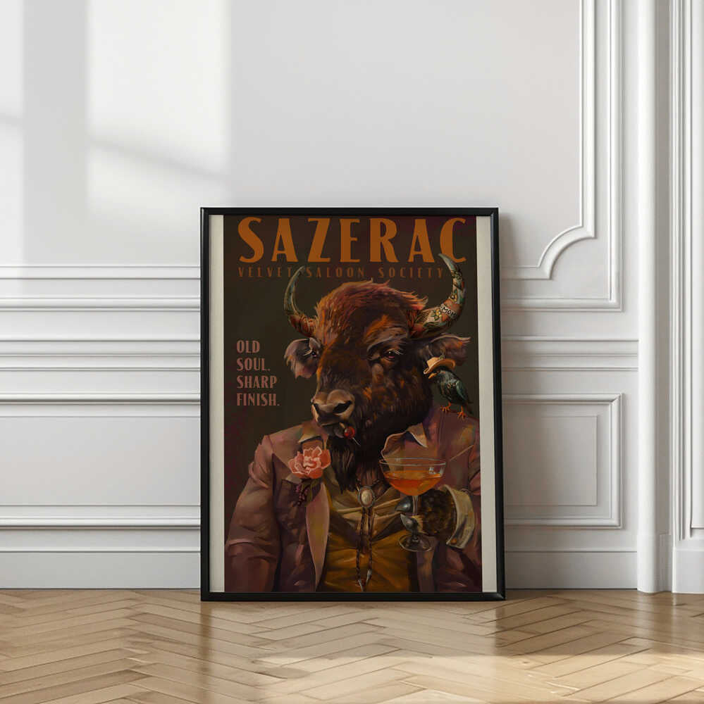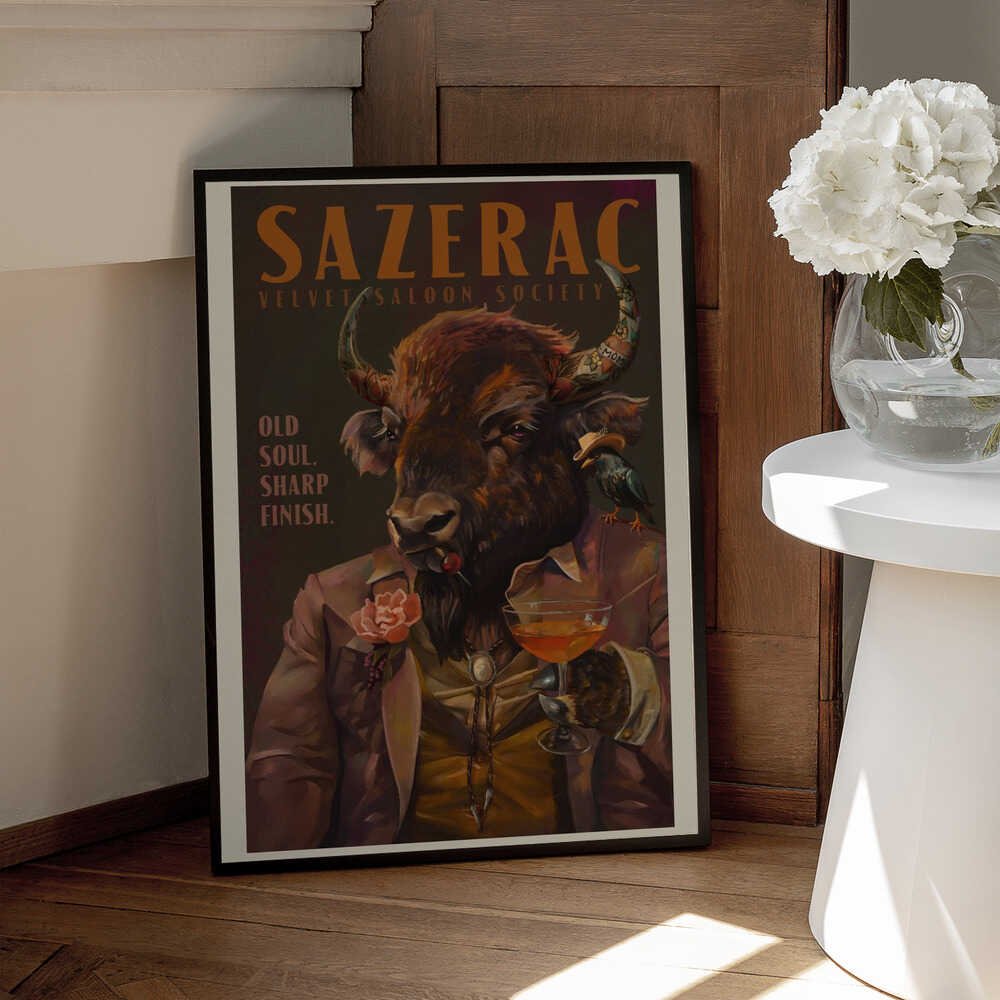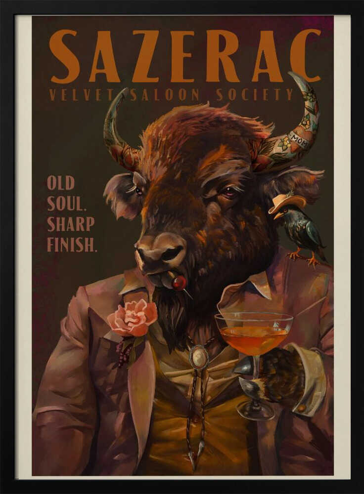 Tabloul înramat „Buffalo Drinking Sazerac Cocktail. Alcohol & Liquor Bar Art”, creat de The Whiskey Ginger, este disponibil în mai multe dimensiuni, cu ramă neagră, albă sau din lemn natur. Se potrivește perfect în orice încăpere.