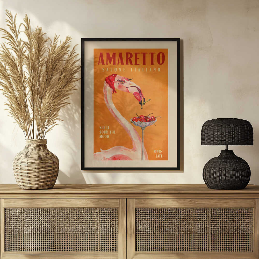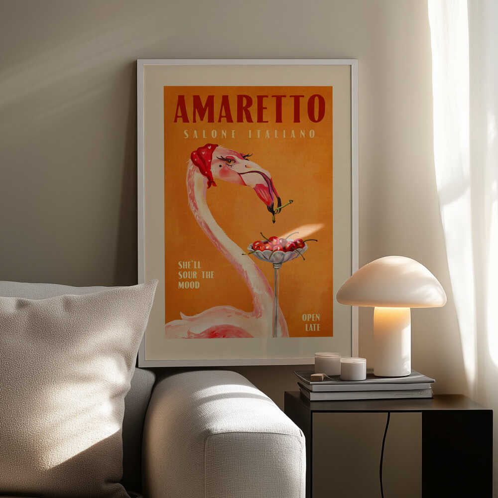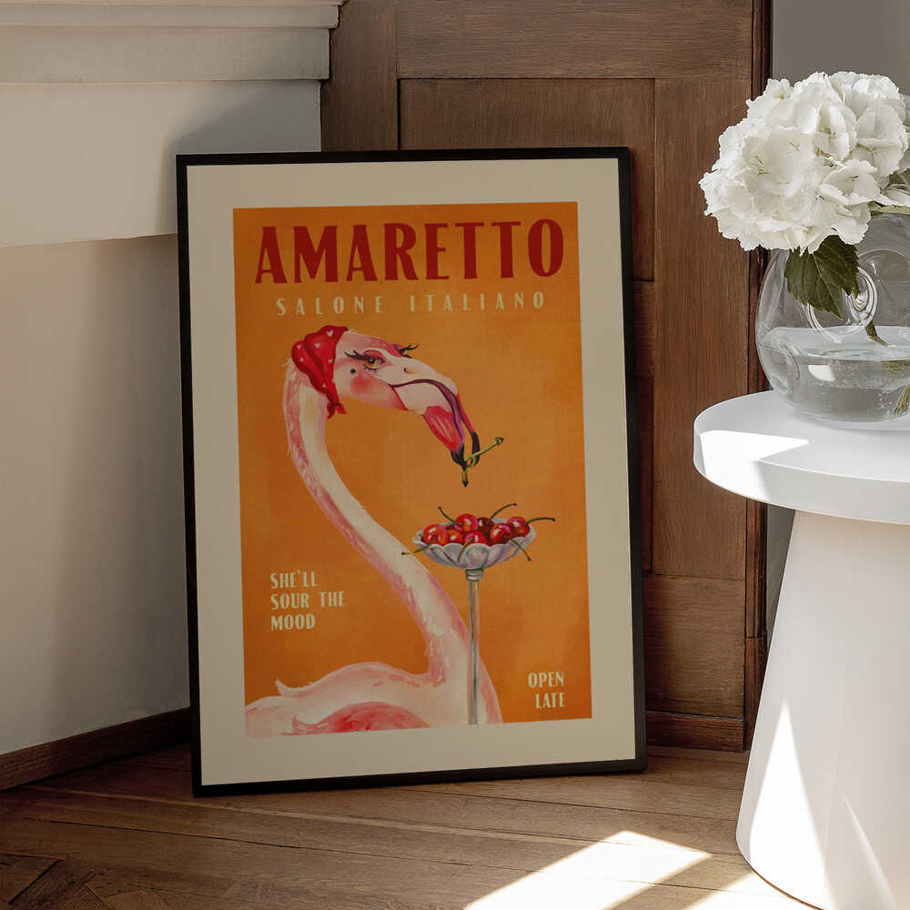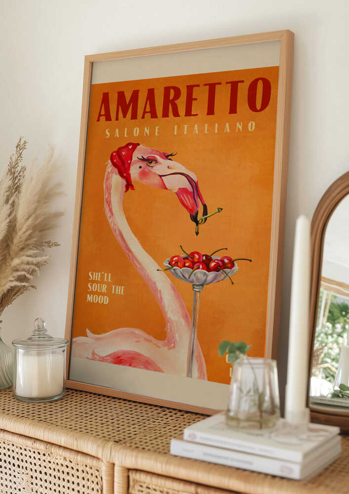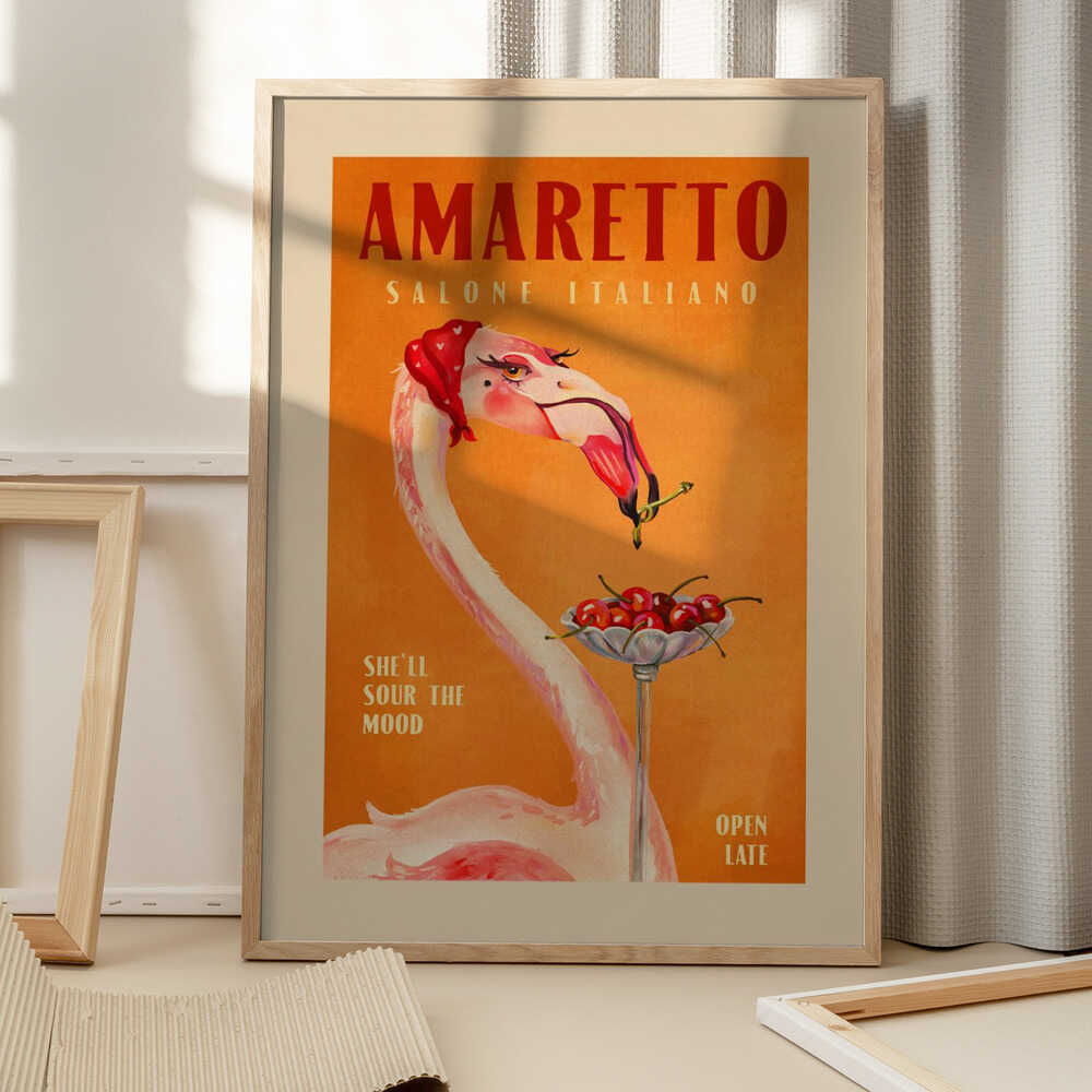Tabloul înramat „Flamingo Delight”, creat de The Whiskey Ginger, este disponibil în mai multe dimensiuni, cu ramă neagră, albă sau din lemn natur. Se potrivește perfect în orice încăpere.