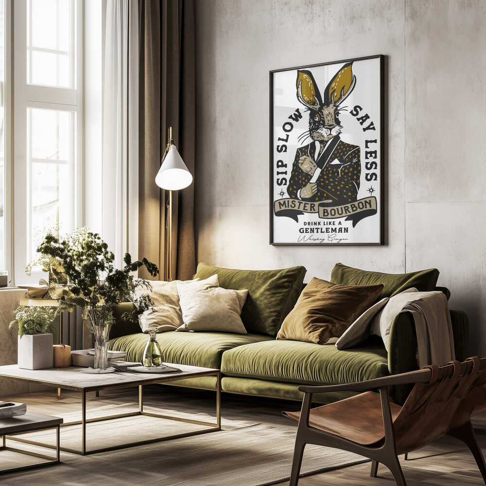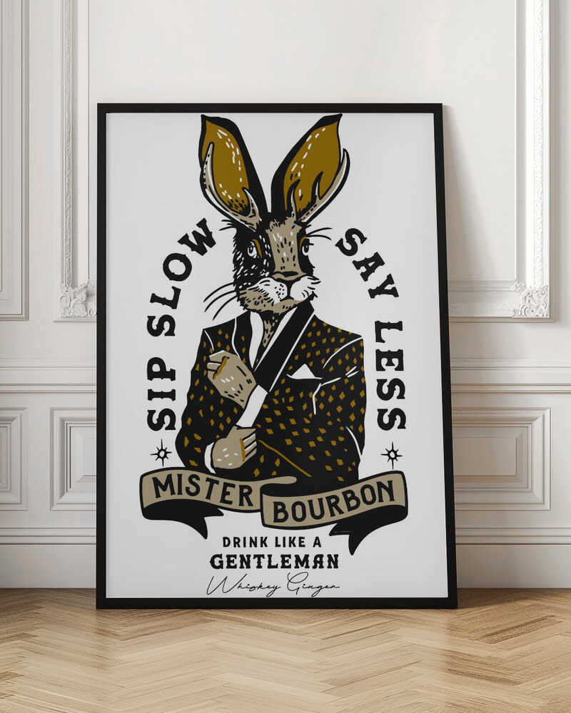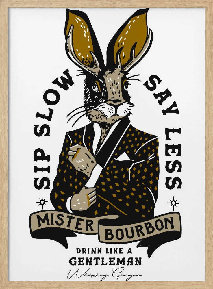 Tabloul înramat „Mister Bourbon Jackalope In Smoking Jacket”, creat de The Whiskey Ginger, este disponibil în mai multe dimensiuni, cu ramă neagră, albă sau din lemn natur. Se potrivește perfect în orice încăpere.