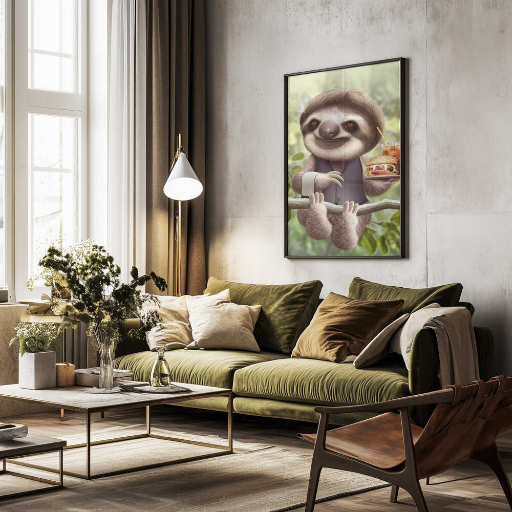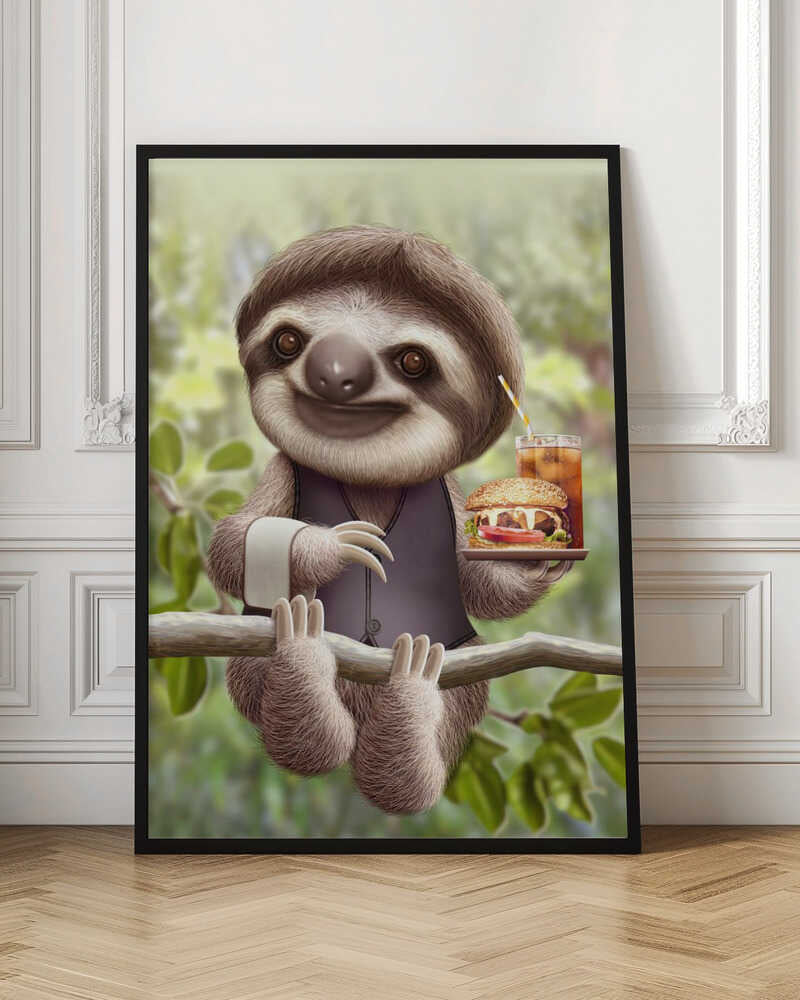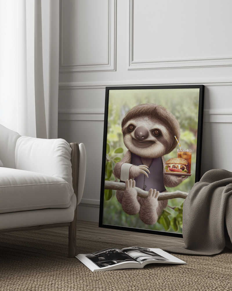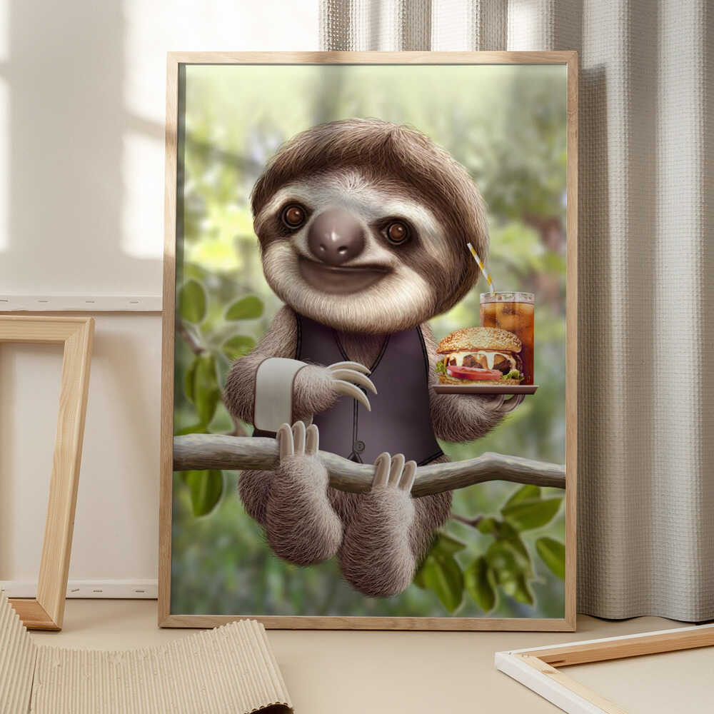 Tabloul înramat „SLOTH ONTREE DELIVERY”, creat de Adam Lawless, este disponibil în mai multe dimensiuni, cu ramă neagră, albă sau din lemn natur. Se potrivește perfect în orice încăpere.
