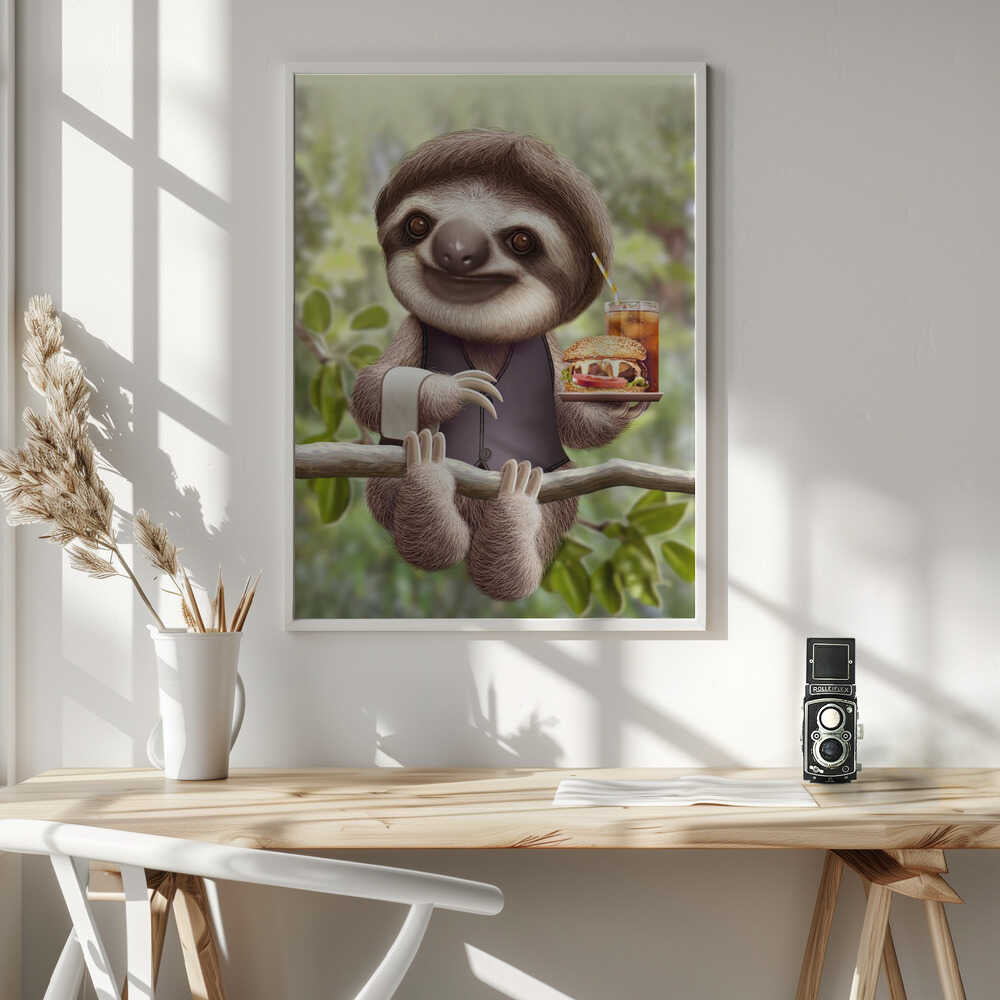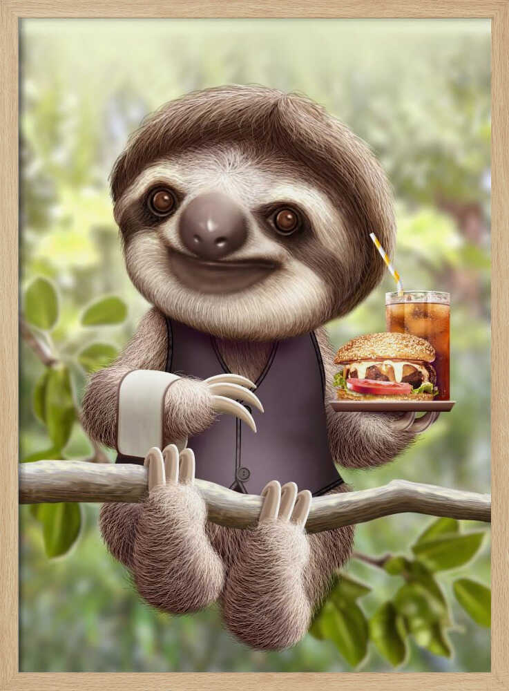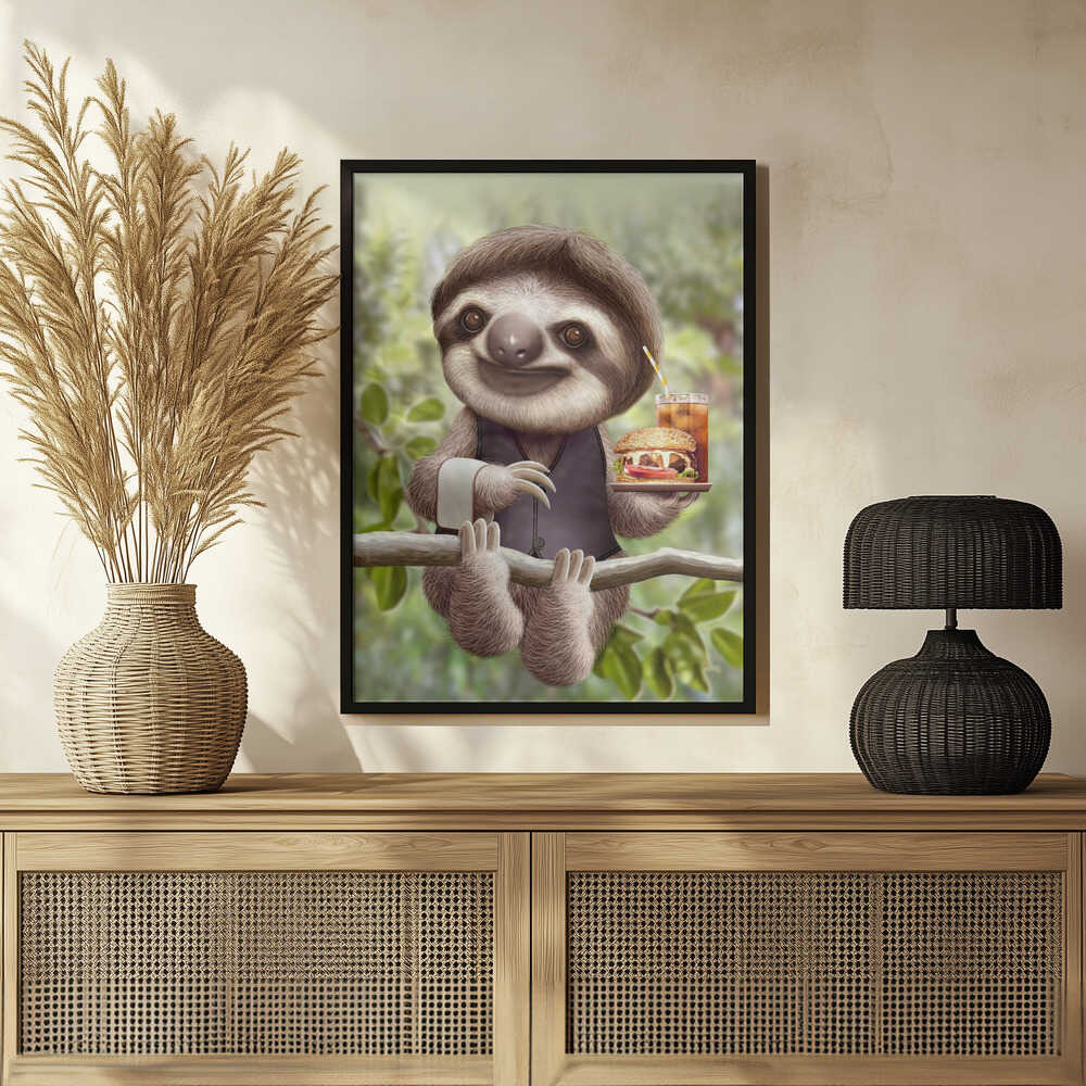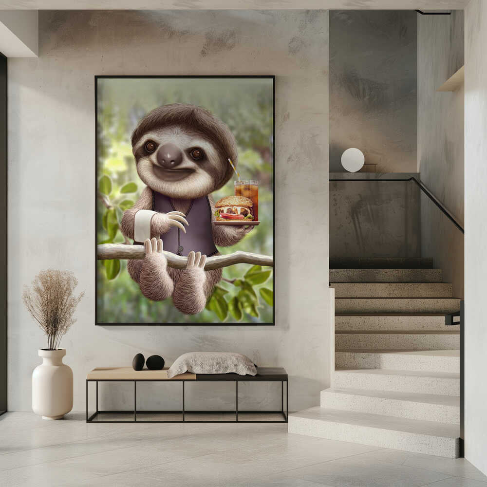 Tabloul înramat „SLOTH ONTREE DELIVERY”, creat de Adam Lawless, este disponibil în mai multe dimensiuni, cu ramă neagră, albă sau din lemn natur. Se potrivește perfect în orice încăpere.