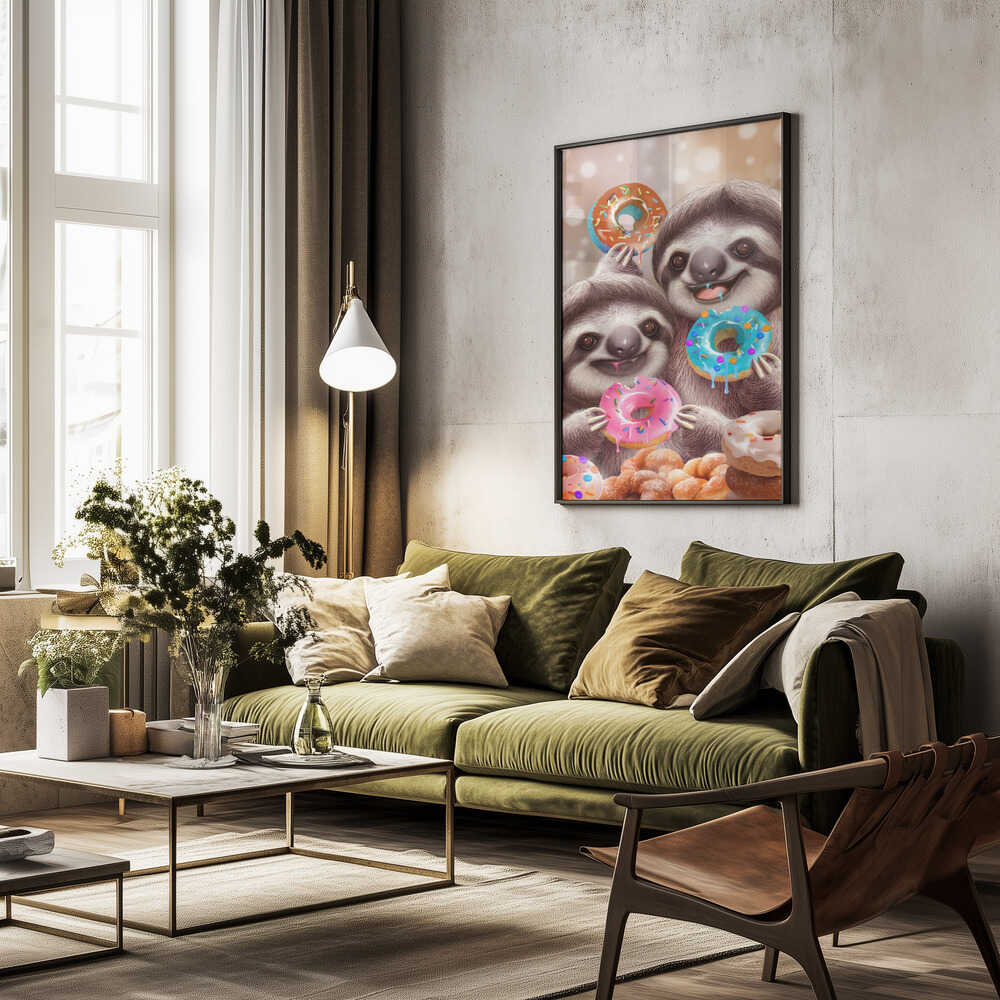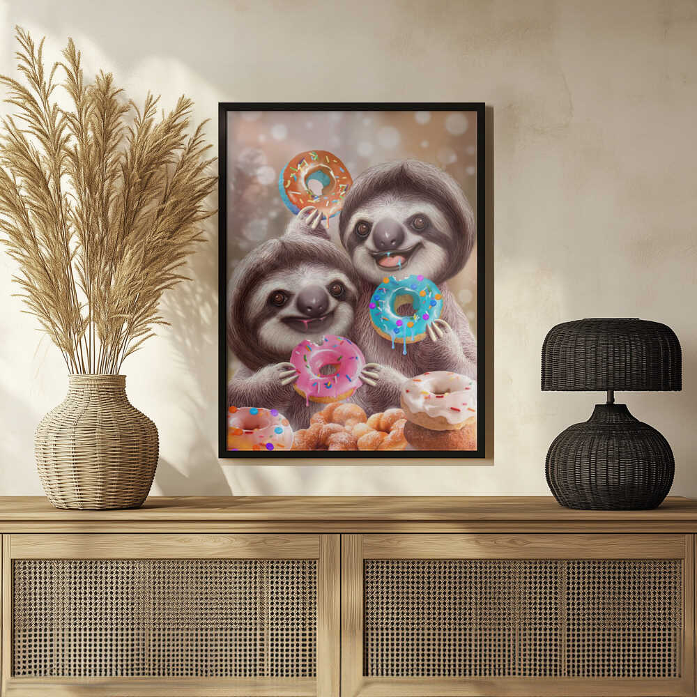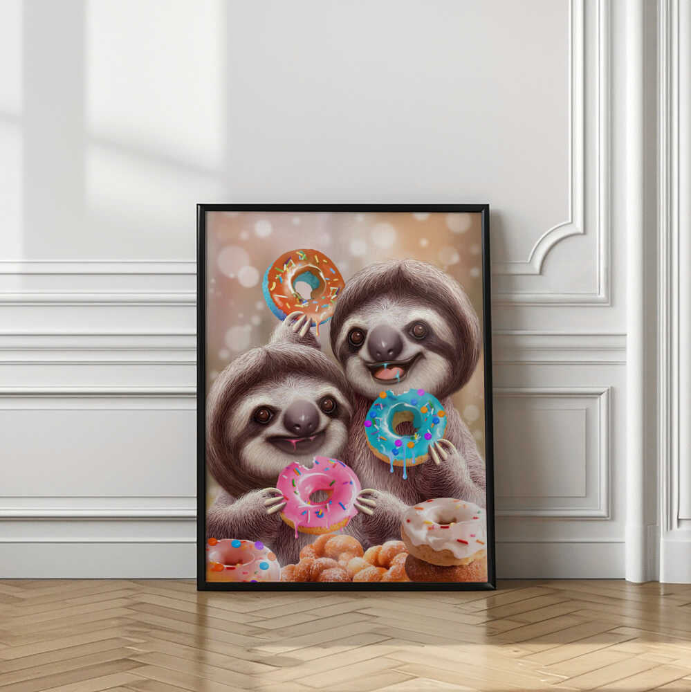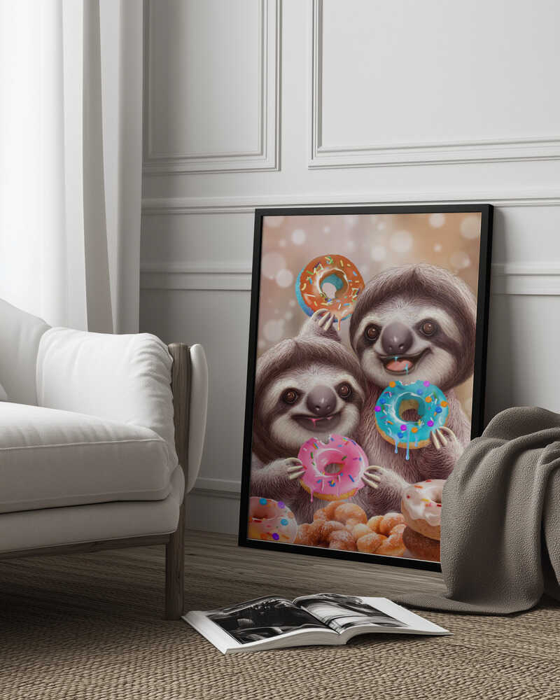 Tabloul înramat „SLOTHS EATING DONUTS”, creat de Adam Lawless, este disponibil în mai multe dimensiuni, cu ramă neagră, albă sau din lemn natur. Se potrivește perfect în orice încăpere.