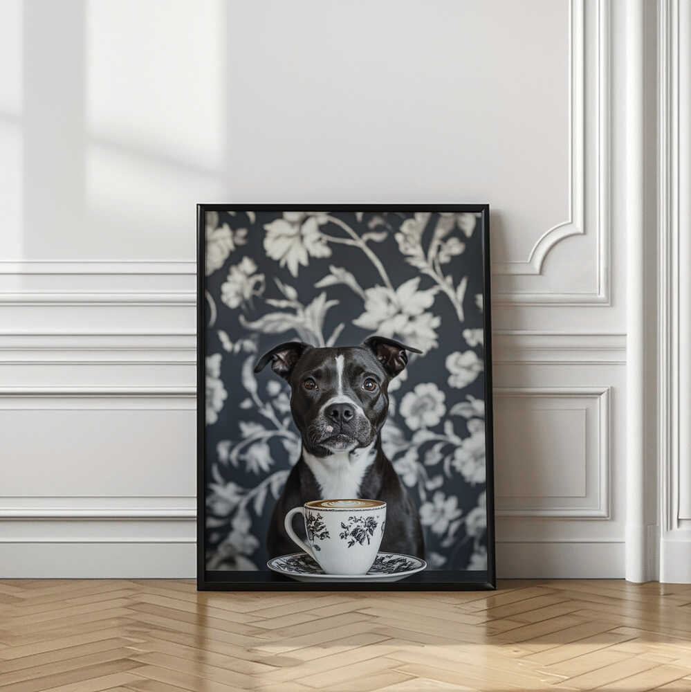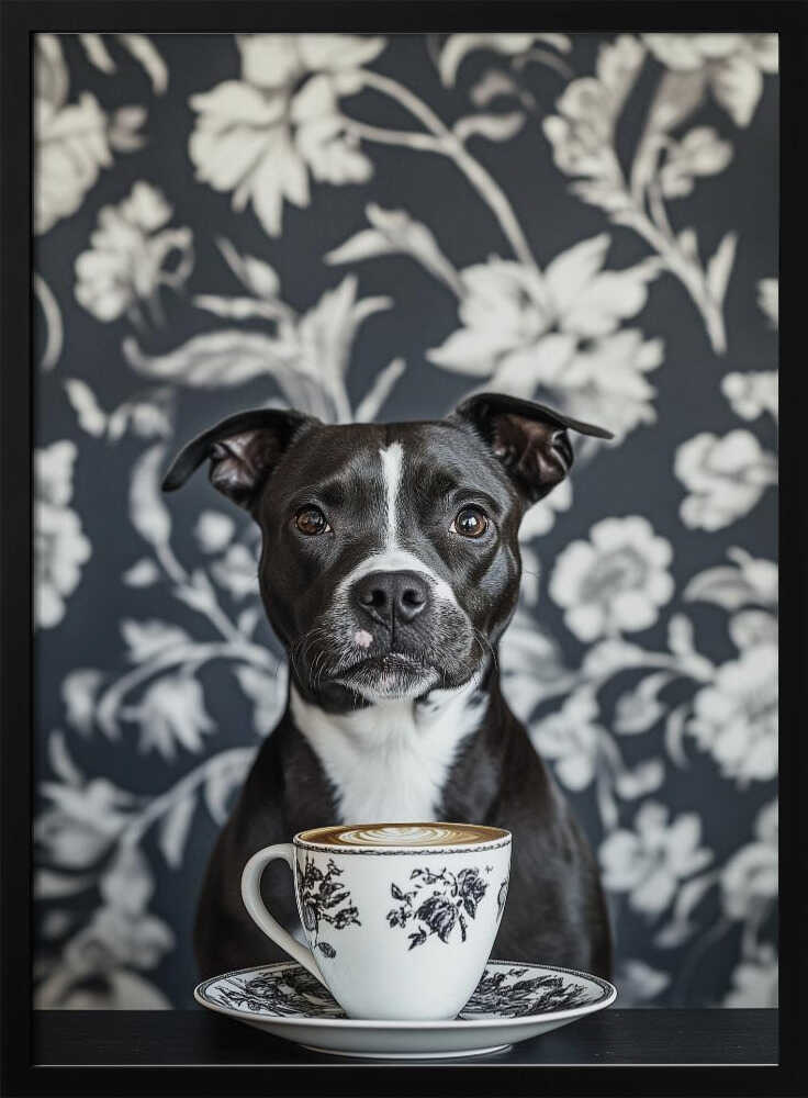 Tabloul înramat „The Latte Loving Staffy”, creat de SHANDU, este disponibil în mai multe dimensiuni, cu ramă neagră, albă sau din lemn natur. Se potrivește perfect în orice încăpere.