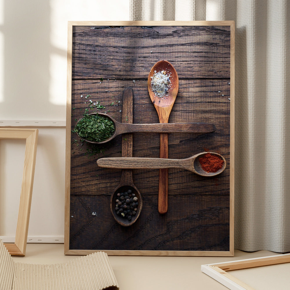 Tabloul înramat „Wooden Spoons With Colorful Spices”, creat de Karina Aleksandrova, este disponibil în mai multe dimensiuni, cu ramă neagră, albă sau din lemn natur. Se potrivește perfect în orice încăpere.