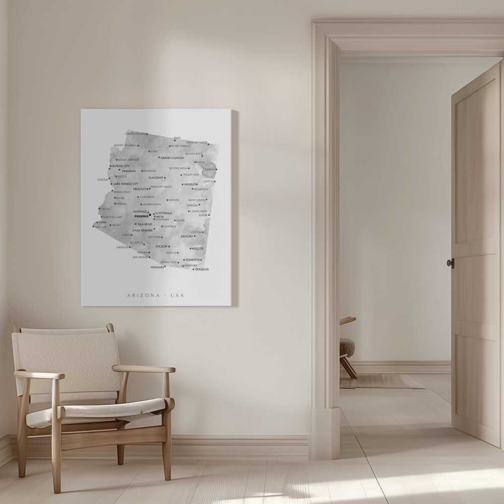 Tablou canvas „Grayscale watercolor map of Arizona, USA” creat de Rosana Laiz Blursbyai, imprimat pe pânză de calitate, gata de agățat. Disponibil în mai multe dimensiuni. Perfect pentru orice spațiu.