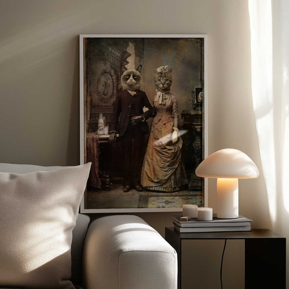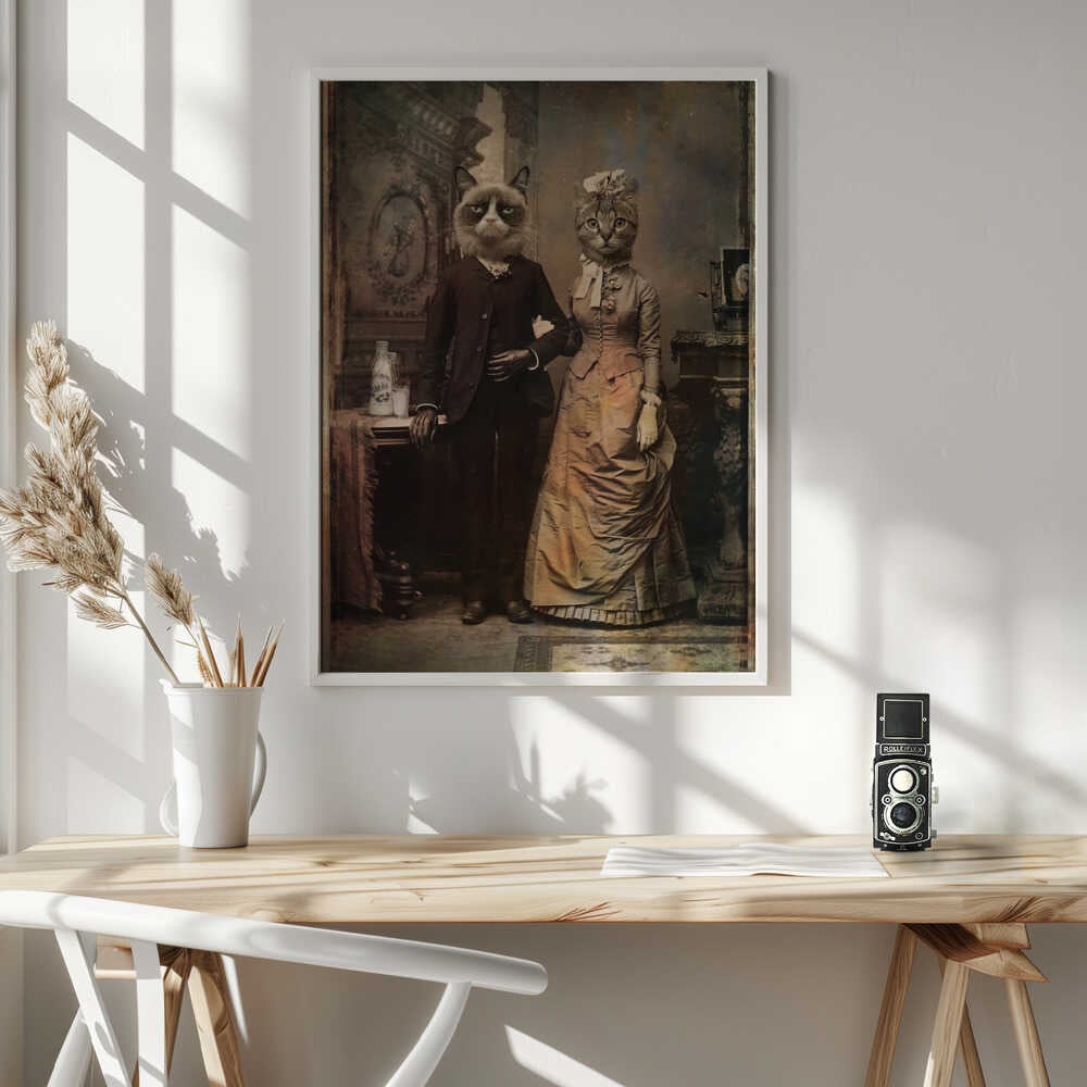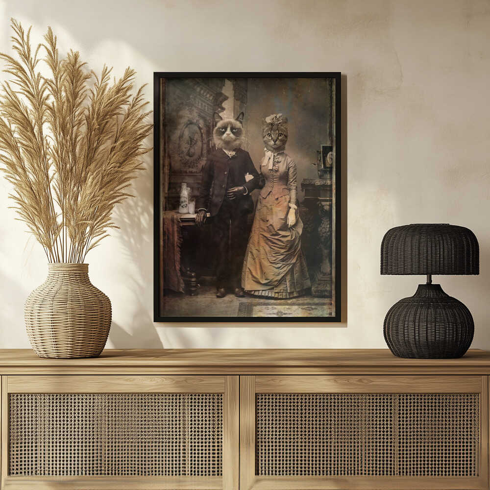 Tabloul înramat „Cat Couple”, creat de DDiArte, este disponibil în mai multe dimensiuni, cu ramă neagră, albă sau din lemn natur. Se potrivește perfect în orice încăpere.