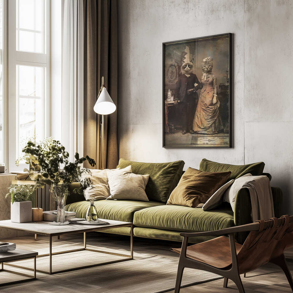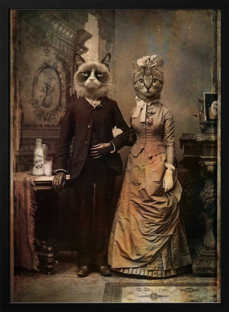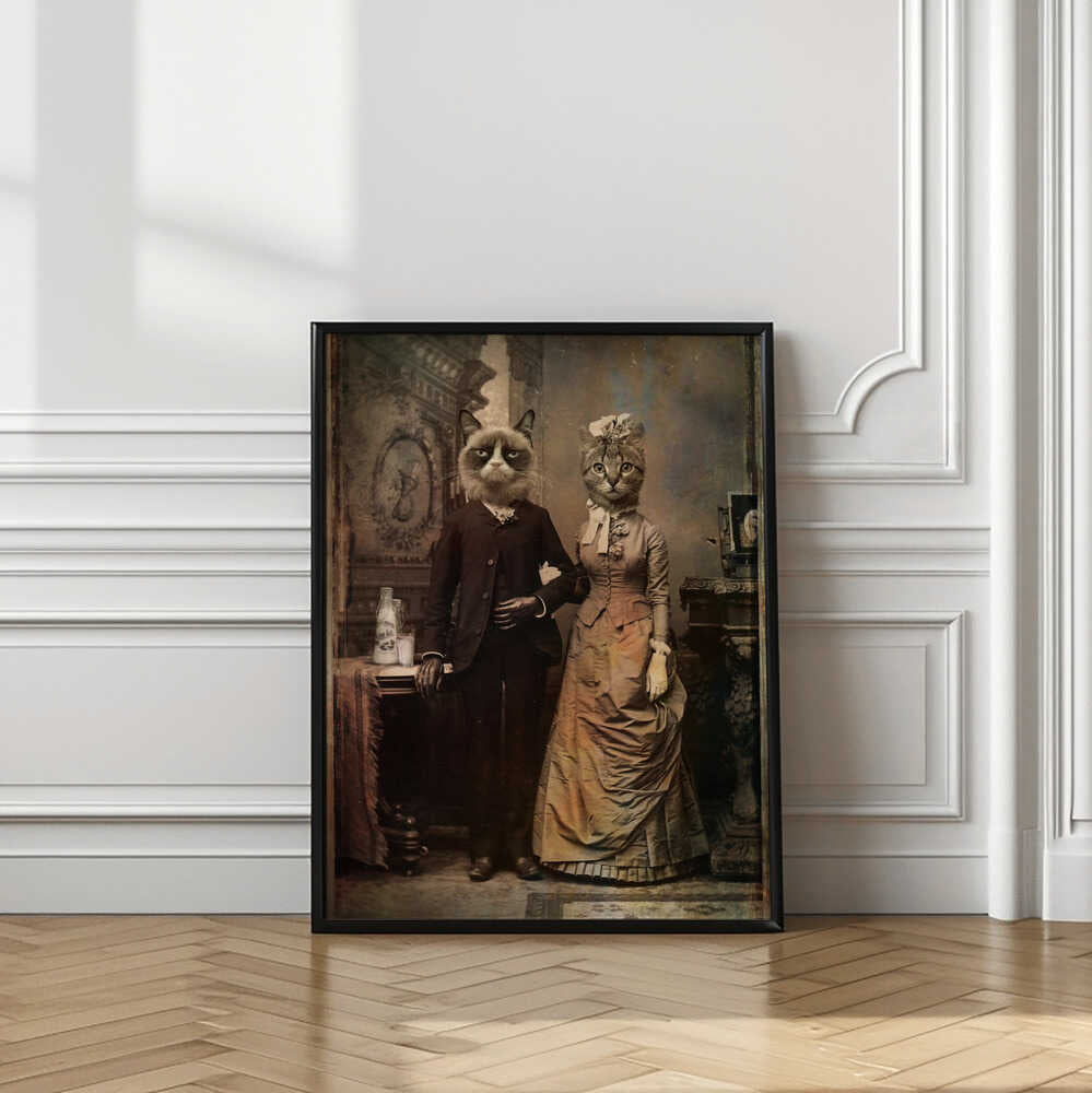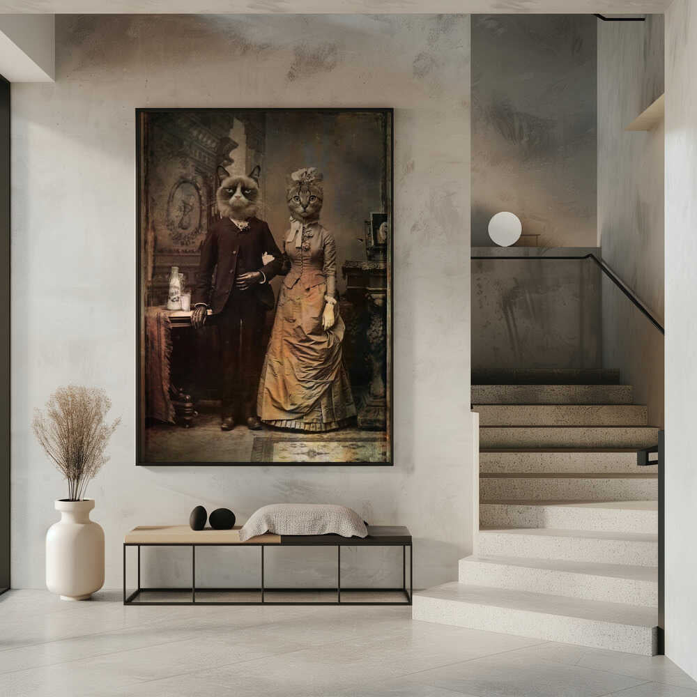 Tabloul înramat „Cat Couple”, creat de DDiArte, este disponibil în mai multe dimensiuni, cu ramă neagră, albă sau din lemn natur. Se potrivește perfect în orice încăpere.