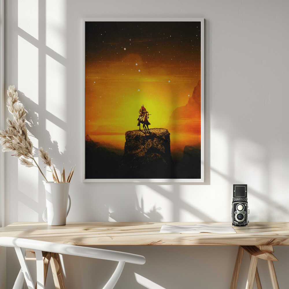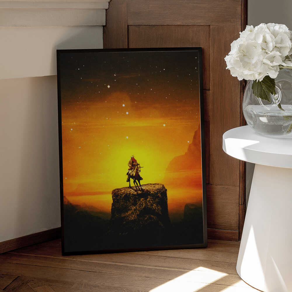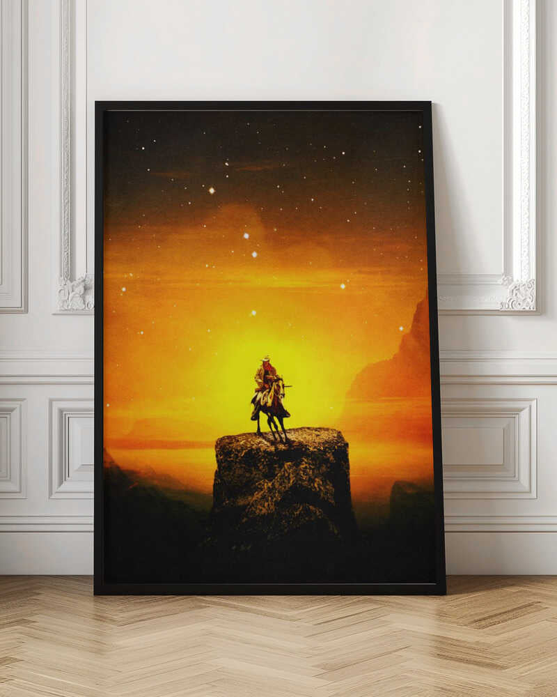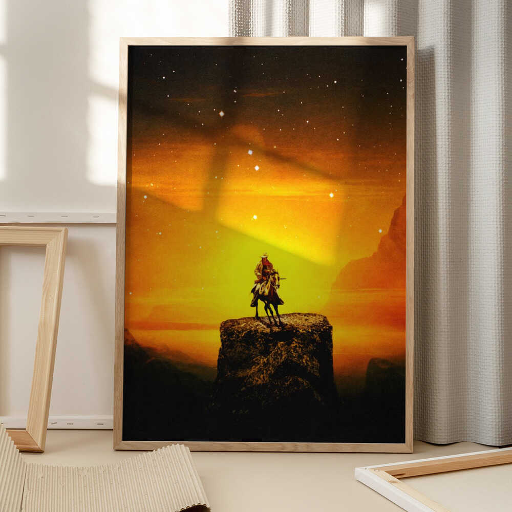 Tabloul înramat „Cowboy III”, creat de Taudalpoi, este disponibil în mai multe dimensiuni, cu ramă neagră, albă sau din lemn natur. Se potrivește perfect în orice încăpere.