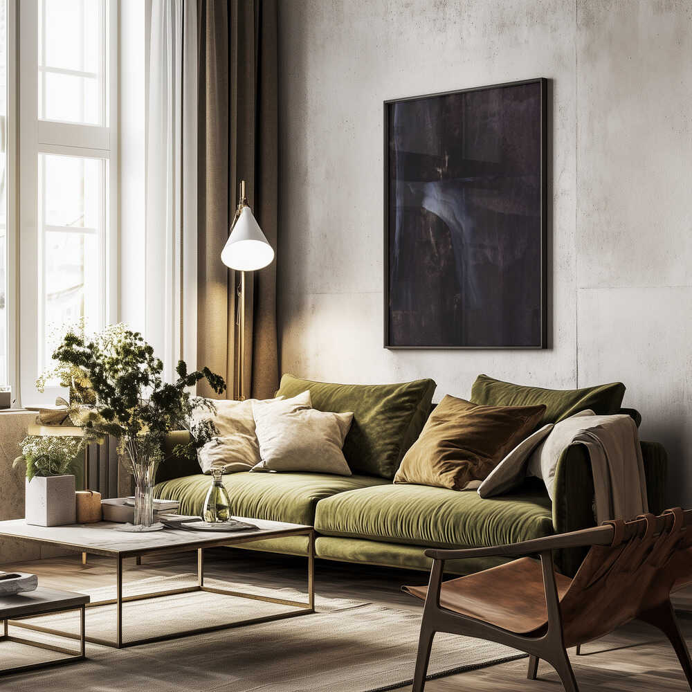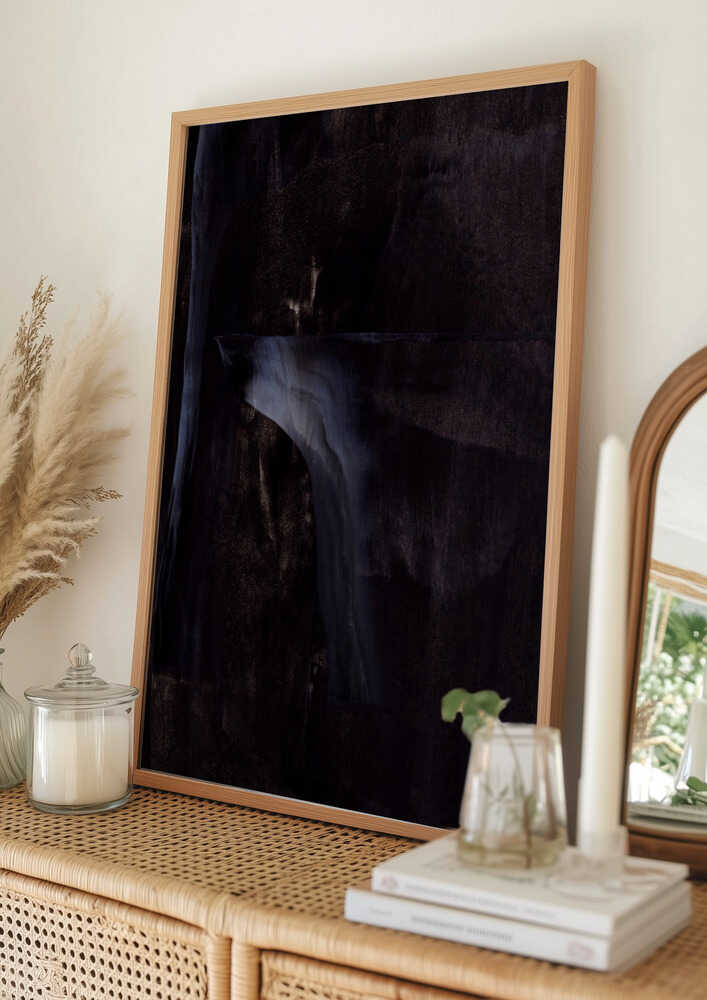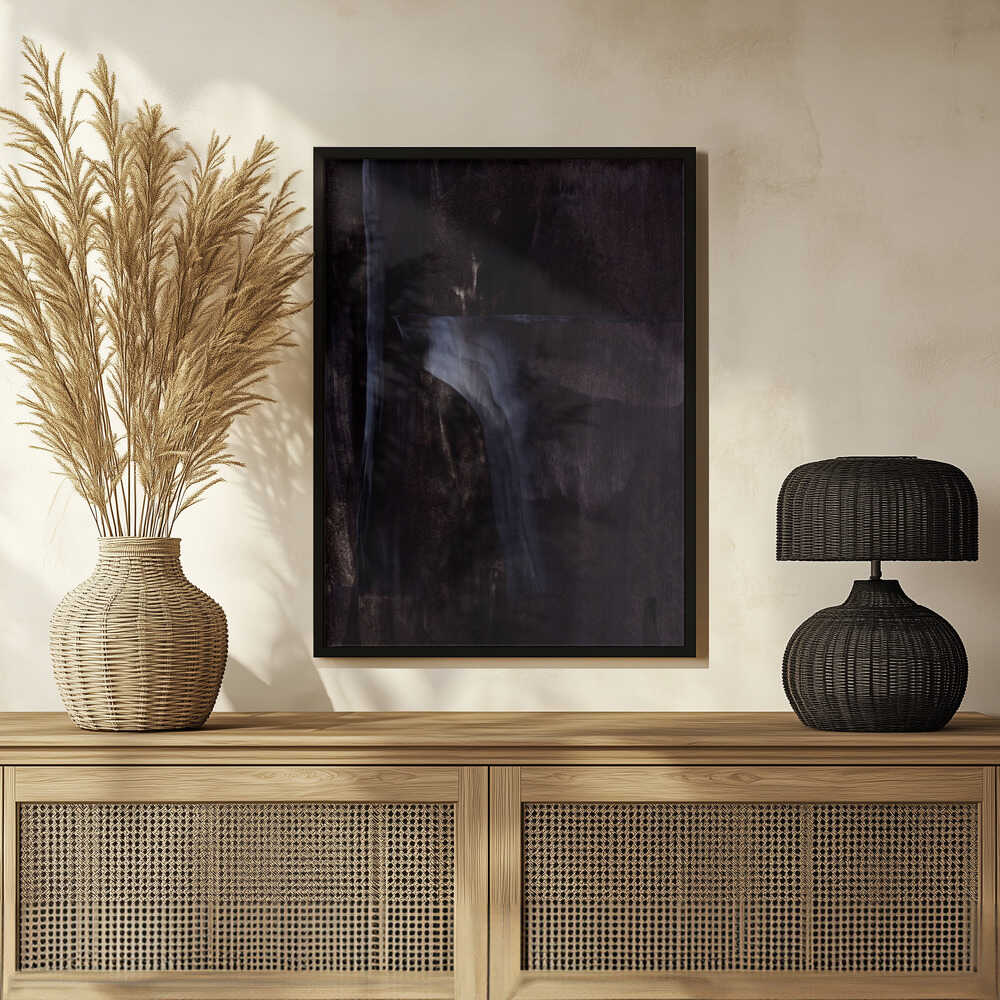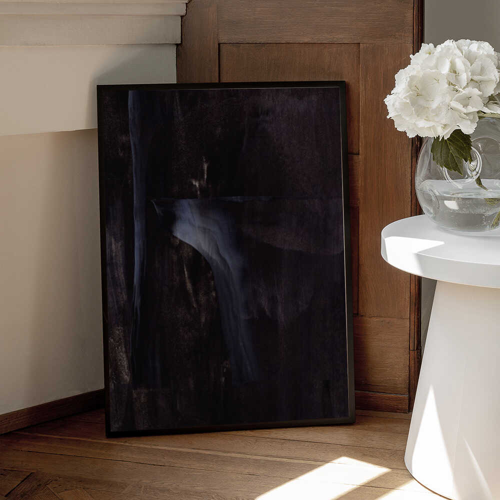 Tabloul înramat „Dark Veil Harmony”, creat de uplusmestudio, este disponibil în mai multe dimensiuni, cu ramă neagră, albă sau din lemn natur. Se potrivește perfect în orice încăpere.