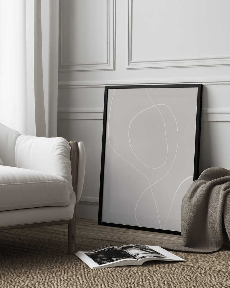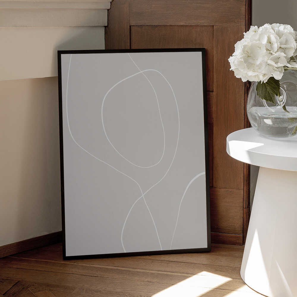 Tabloul înramat „Flowing Lines Harmony”, creat de uplusmestudio, este disponibil în mai multe dimensiuni, cu ramă neagră, albă sau din lemn natur. Se potrivește perfect în orice încăpere.