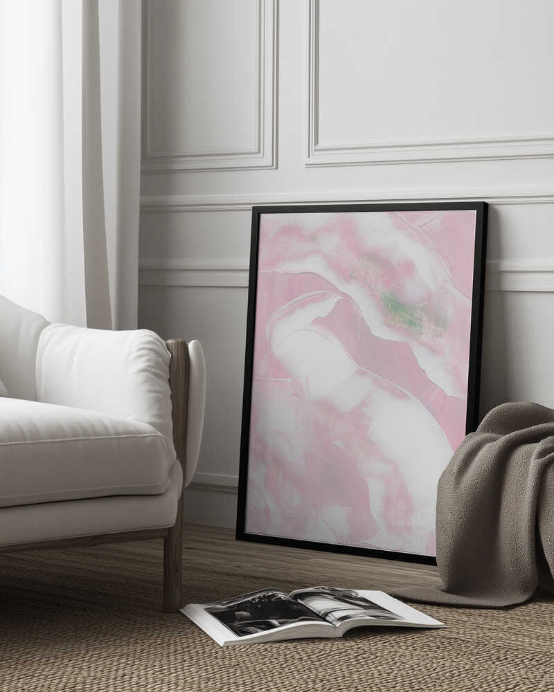 Tabloul înramat „Gentle Blush Fields”, creat de uplusmestudio, este disponibil în mai multe dimensiuni, cu ramă neagră, albă sau din lemn natur. Se potrivește perfect în orice încăpere.