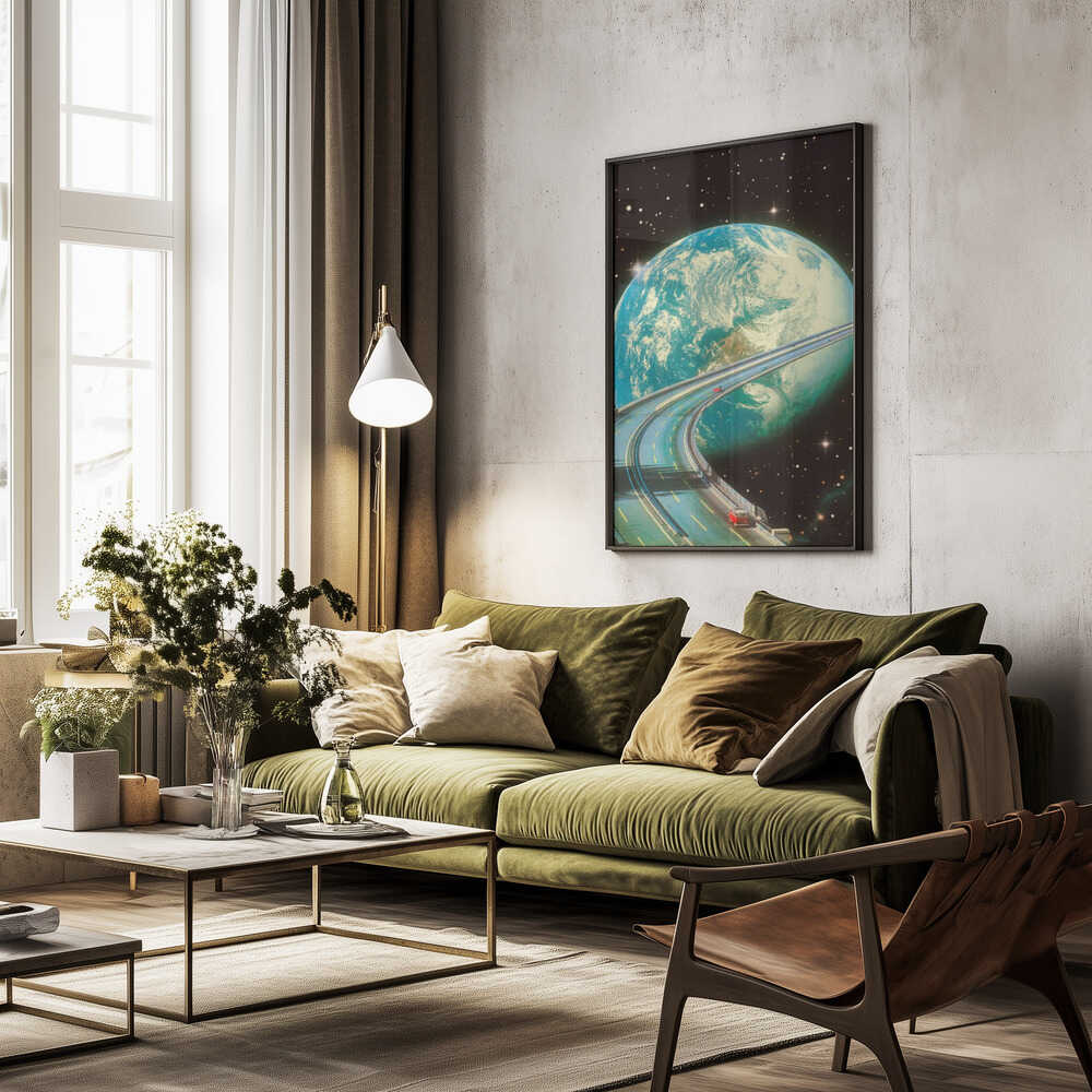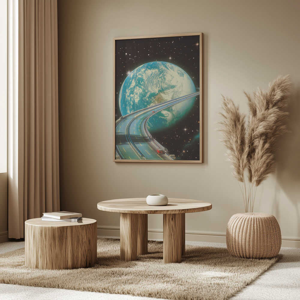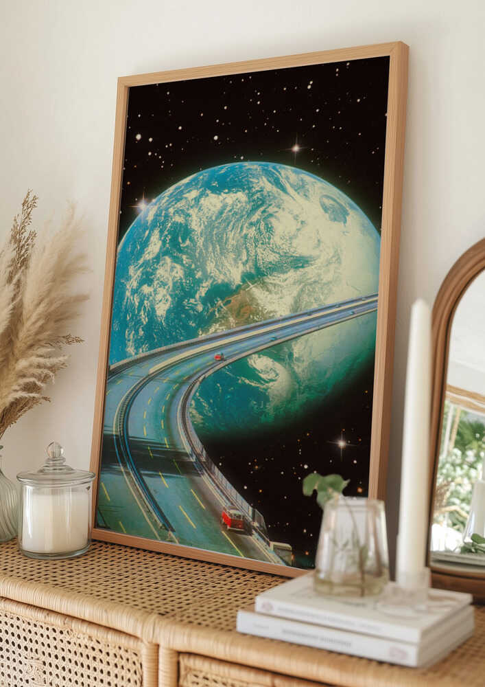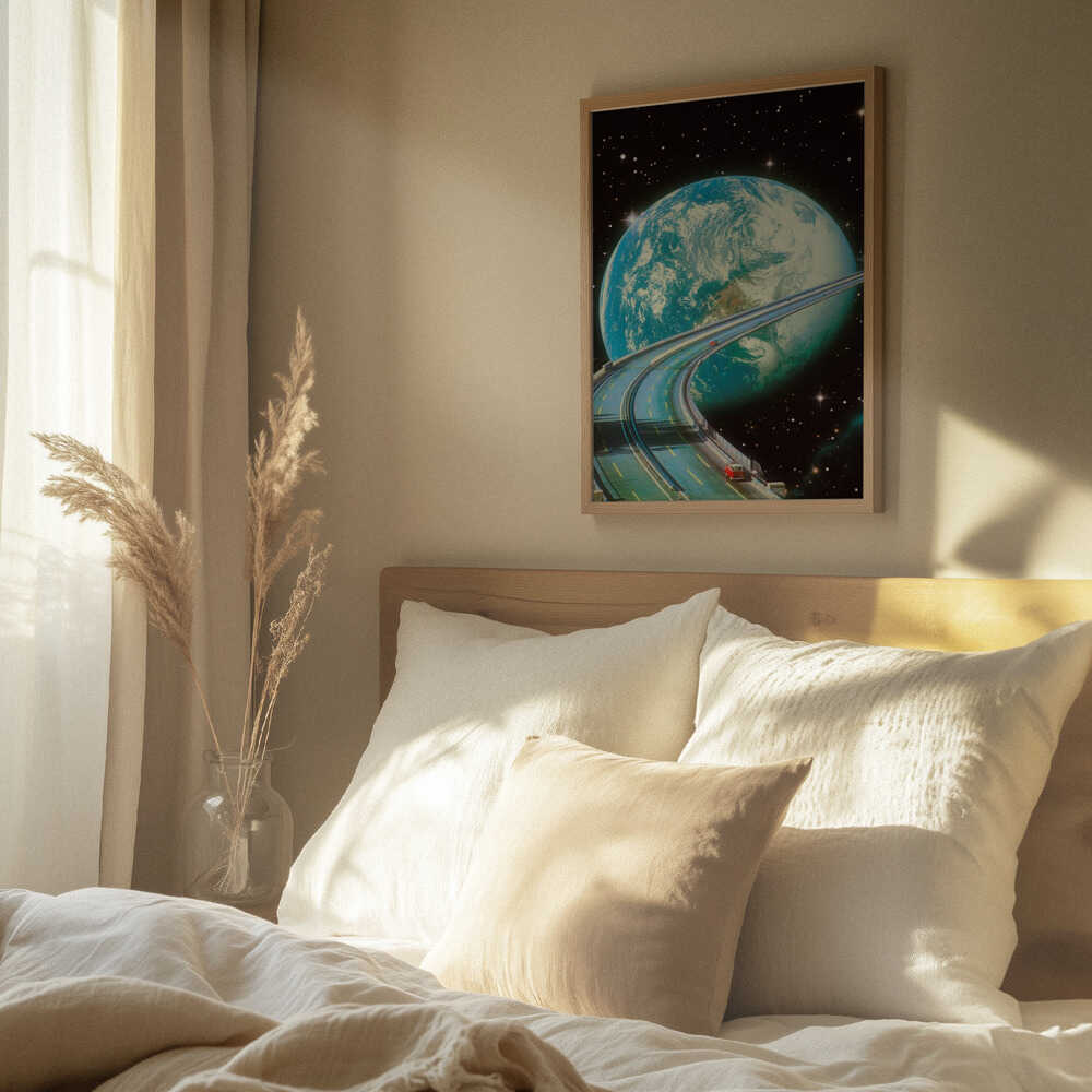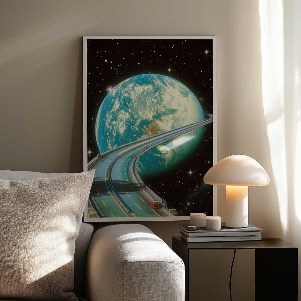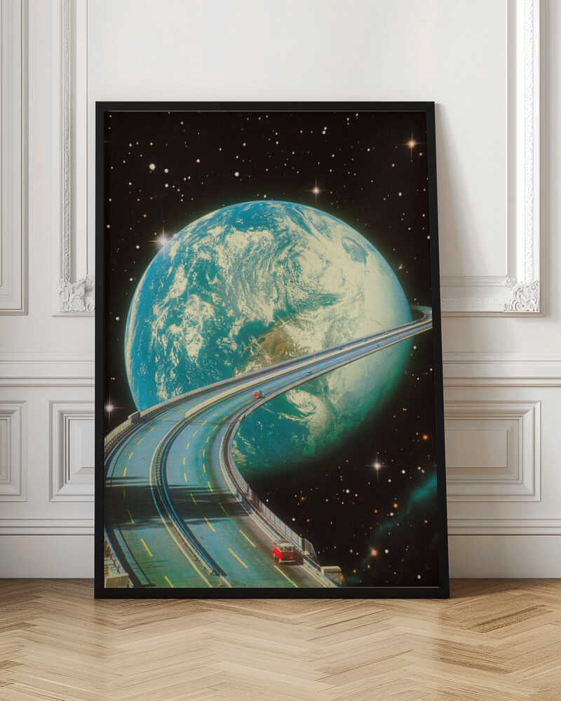 Tabloul înramat „Highway Home”, creat de Taudalpoi, este disponibil în mai multe dimensiuni, cu ramă neagră, albă sau din lemn natur. Se potrivește perfect în orice încăpere.