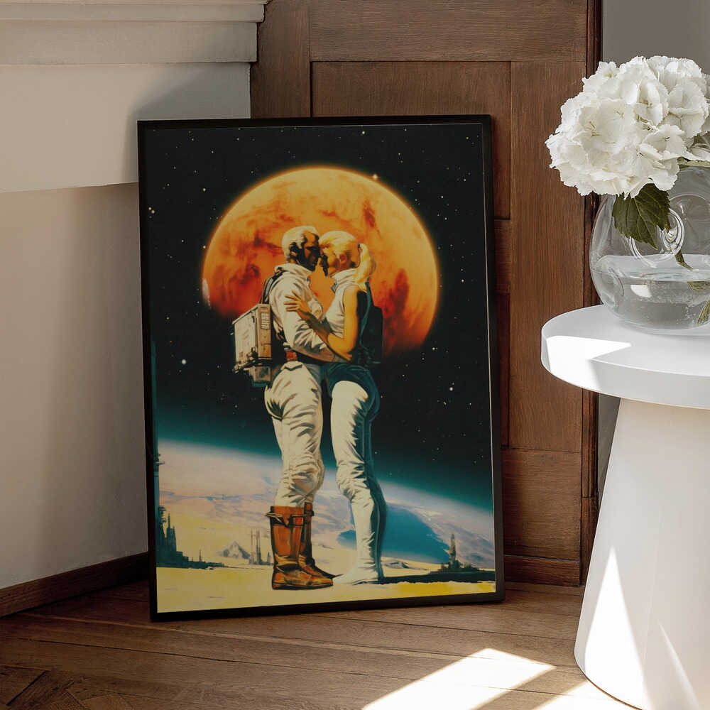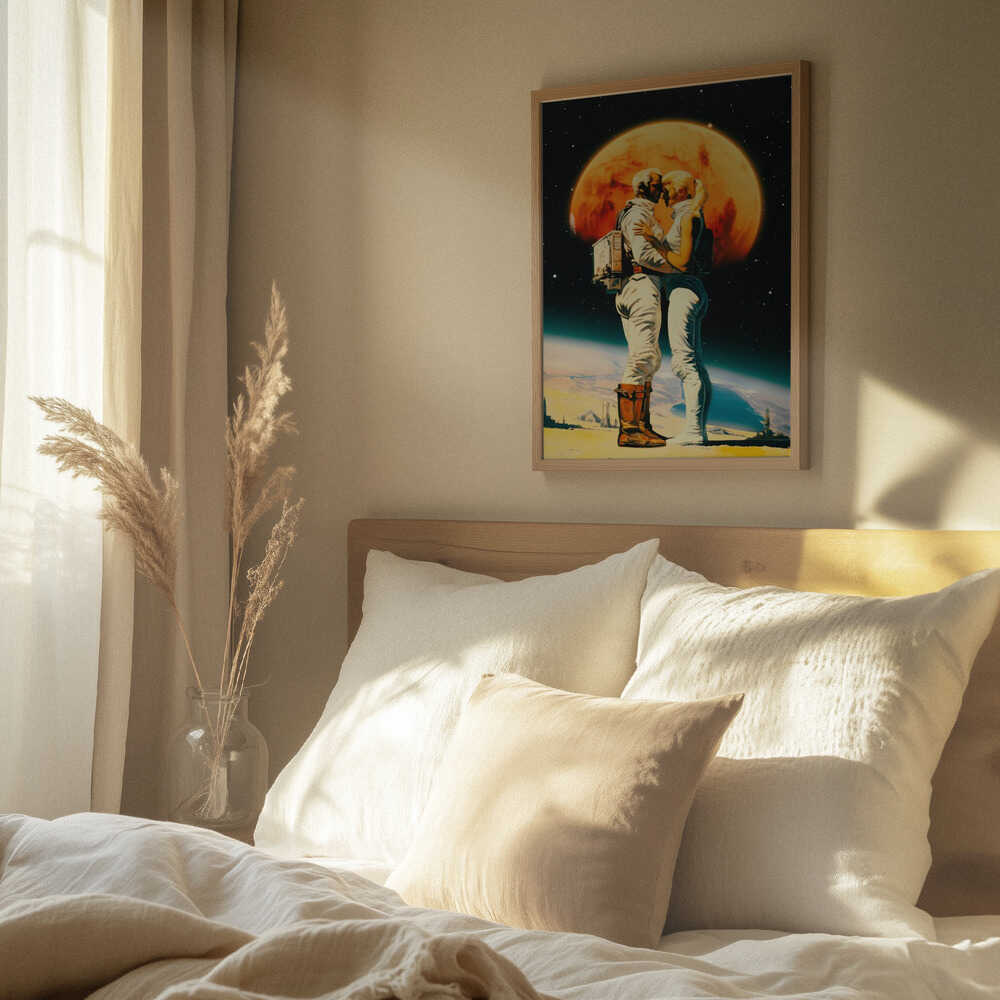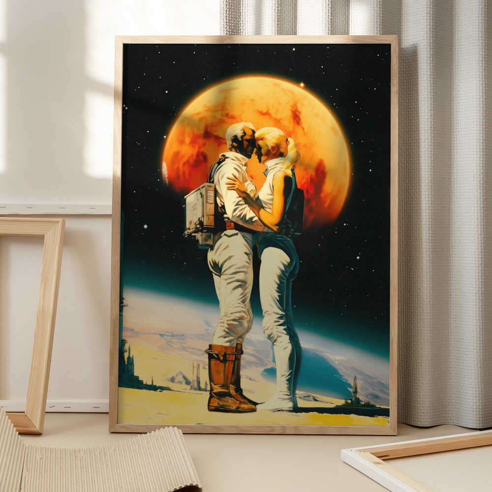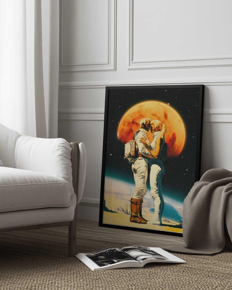Tabloul înramat „Intergalactic Love”, creat de Taudalpoi, este disponibil în mai multe dimensiuni, cu ramă neagră, albă sau din lemn natur. Se potrivește perfect în orice încăpere.