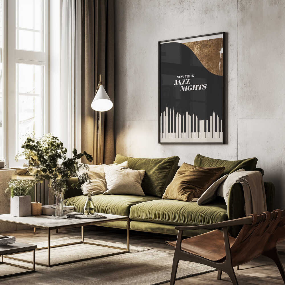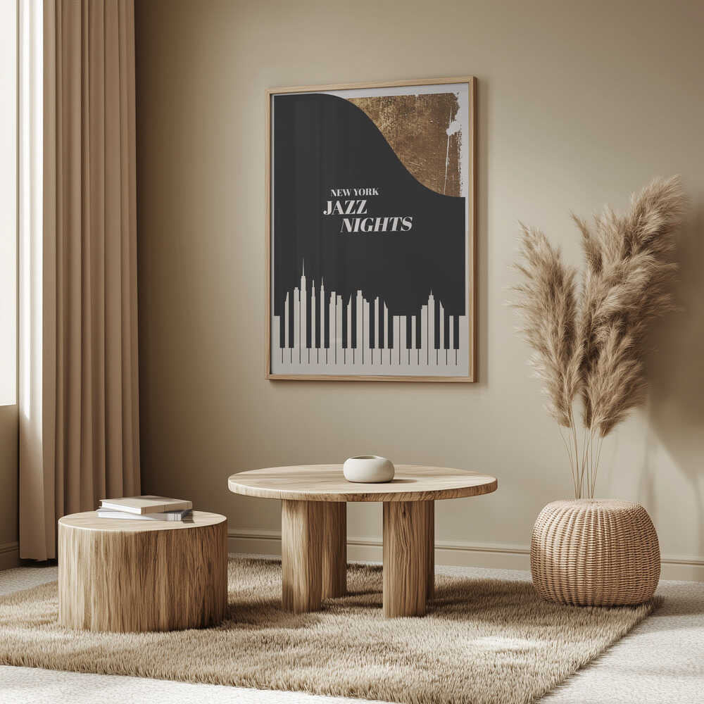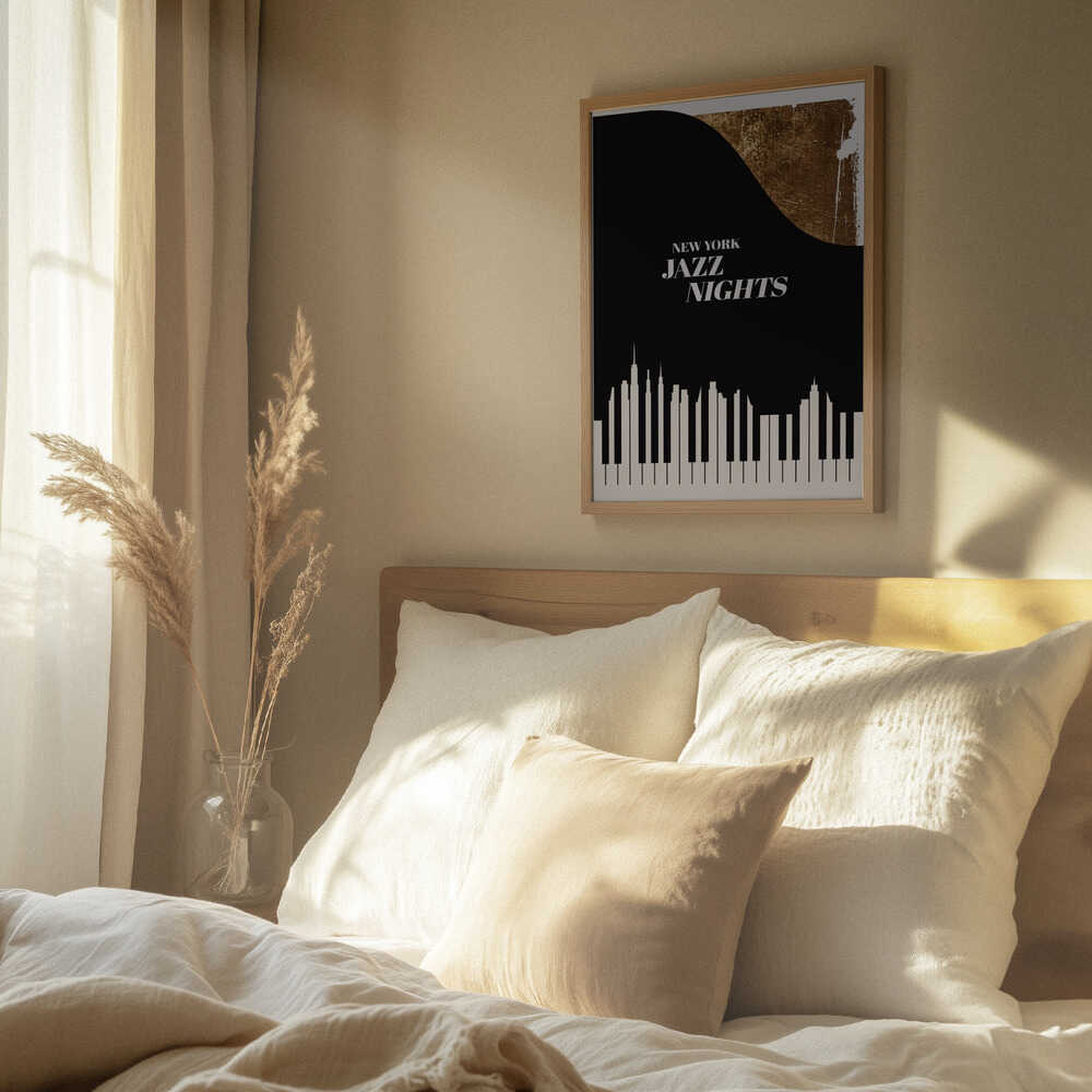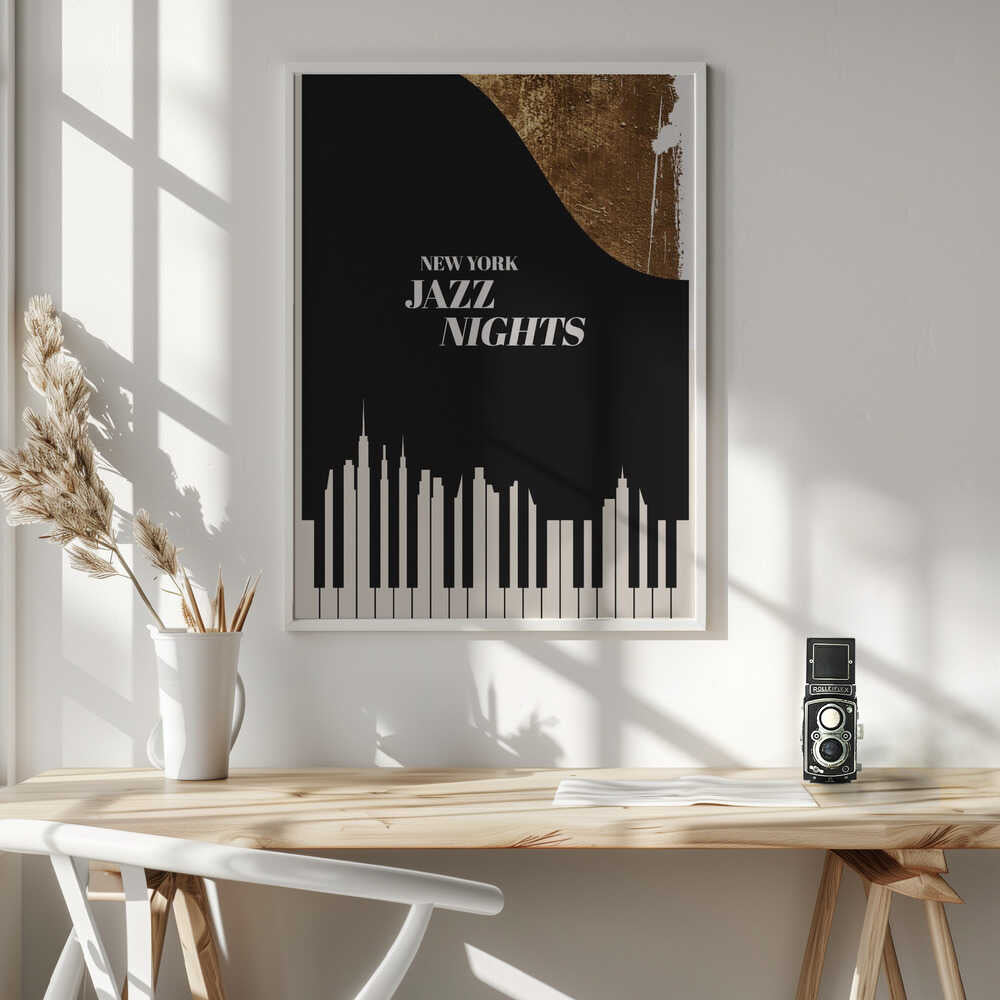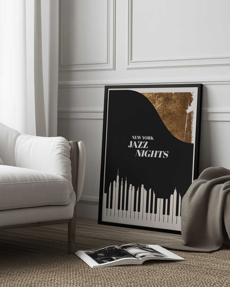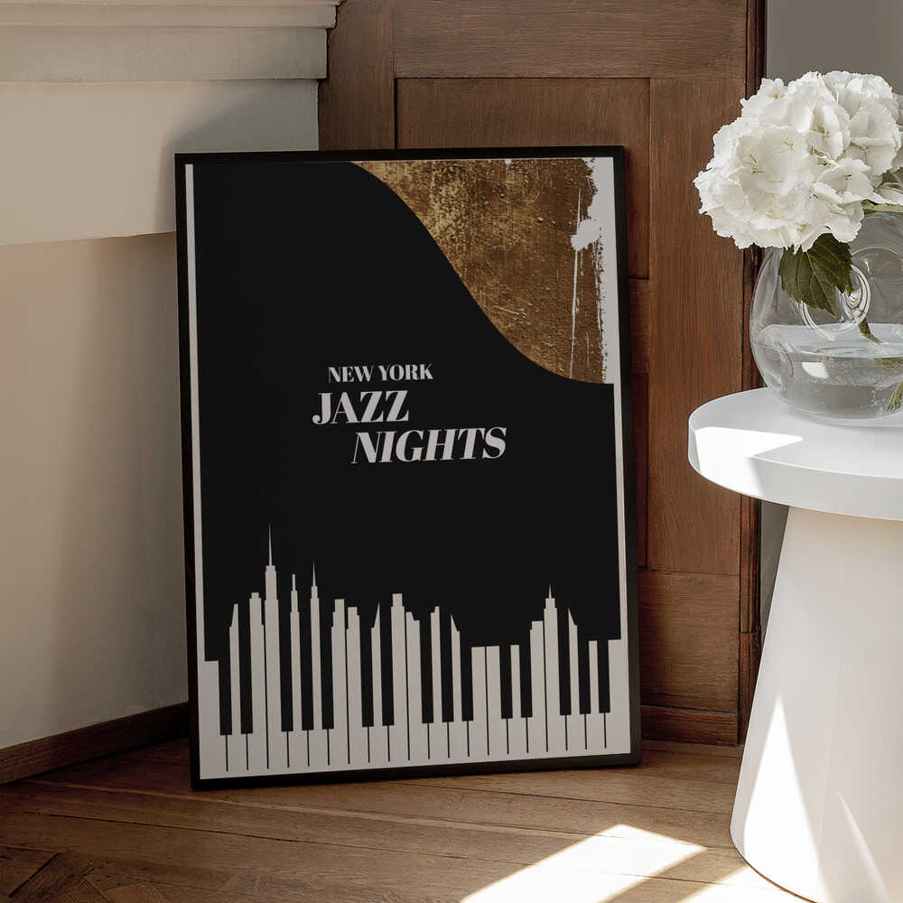 Tabloul înramat „Jazz Nights”, creat de Kubistika, este disponibil în mai multe dimensiuni, cu ramă neagră, albă sau din lemn natur. Se potrivește perfect în orice încăpere.