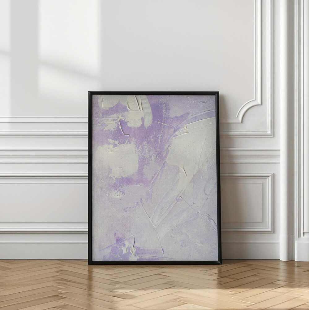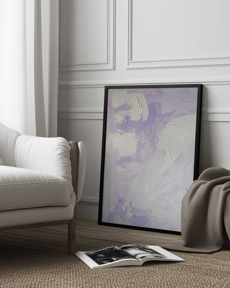 Tabloul înramat „Lavender Whispers”, creat de uplusmestudio, este disponibil în mai multe dimensiuni, cu ramă neagră, albă sau din lemn natur. Se potrivește perfect în orice încăpere.