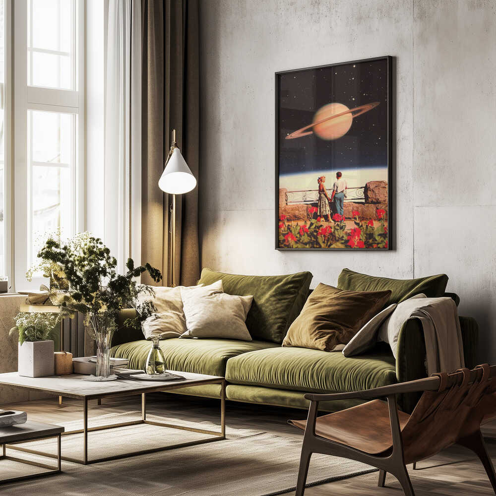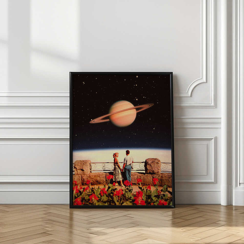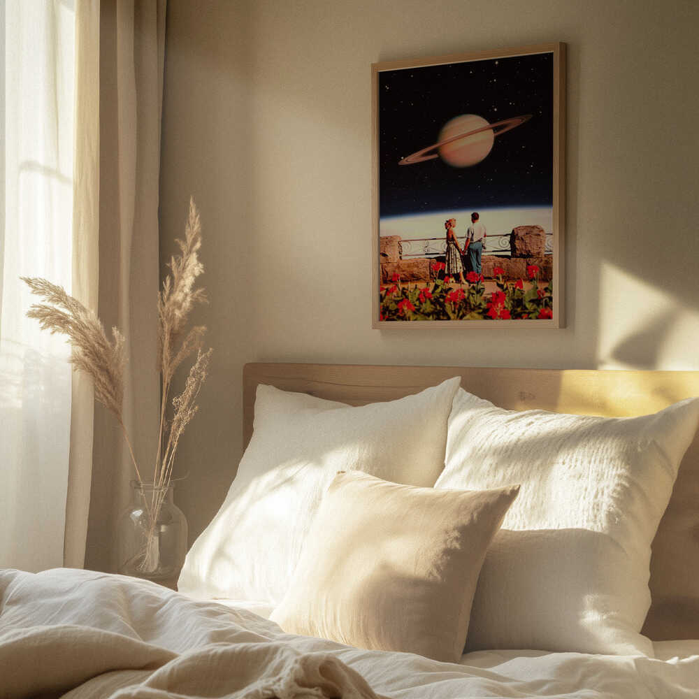 Tabloul înramat „Lovers In Space”, creat de Taudalpoi, este disponibil în mai multe dimensiuni, cu ramă neagră, albă sau din lemn natur. Se potrivește perfect în orice încăpere.