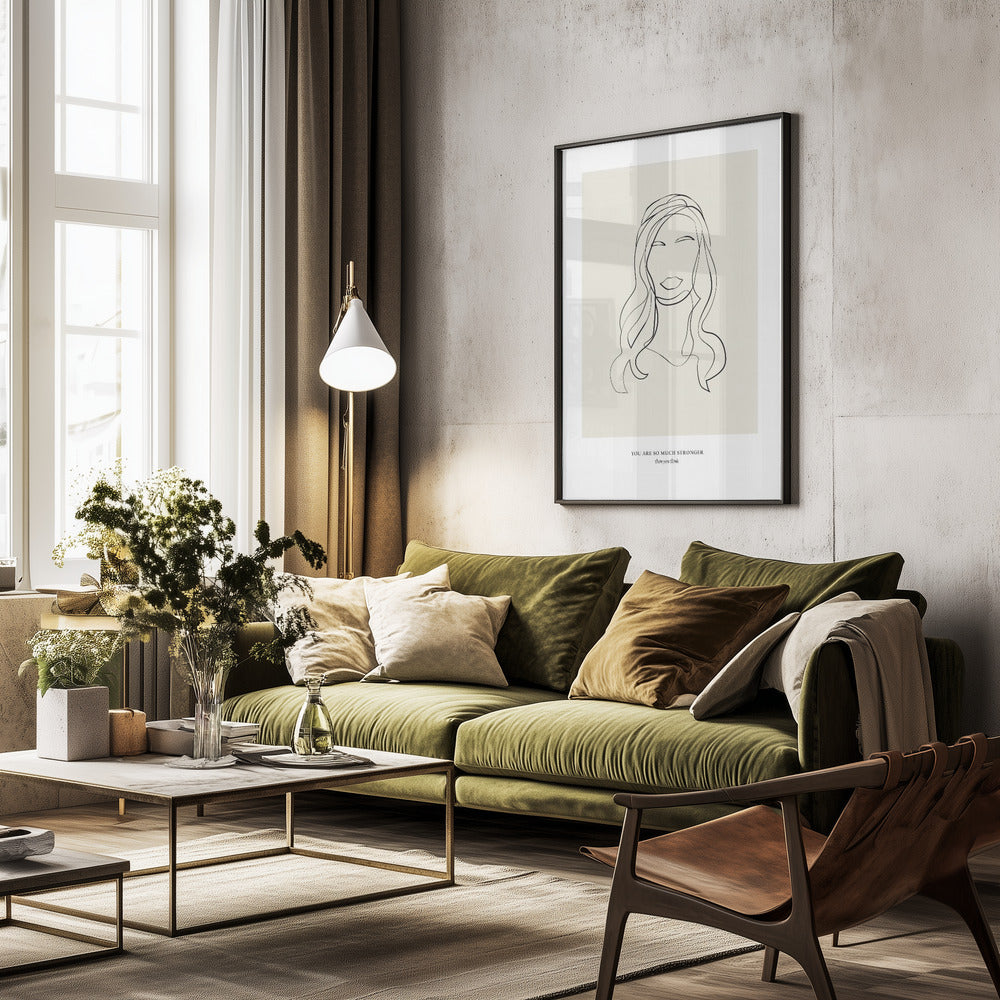 Tabloul înramat „Modern Line Art”, creat de NKTN, este disponibil în mai multe dimensiuni, cu ramă neagră, albă sau din lemn natur. Se potrivește perfect în orice încăpere.
