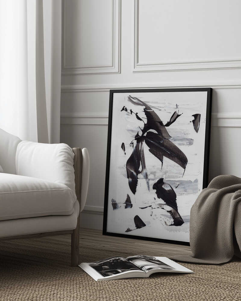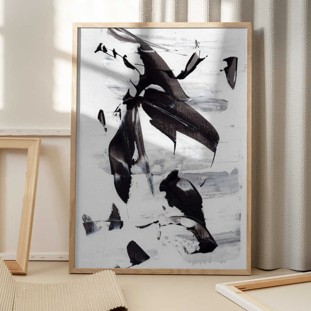 Tabloul înramat „Monochrome Dynamic Brushstrokes”, creat de uplusmestudio, este disponibil în mai multe dimensiuni, cu ramă neagră, albă sau din lemn natur. Se potrivește perfect în orice încăpere.